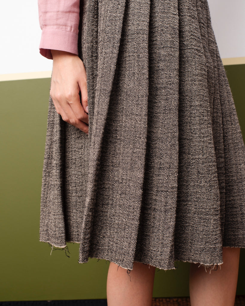 Two sides, endless ways to wear. Knee-length pleated herringbone skirt in 100% merino wool, handcrafted in India.