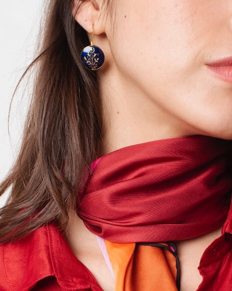 Handcrafted dangling earrings inspired by the Hibiscus Boota motif. Made in brass, 22kt gold plated, and hand-enamelled in deep blue. Features a hoop with secure back-lock - elegant, artisanal, and timeless.