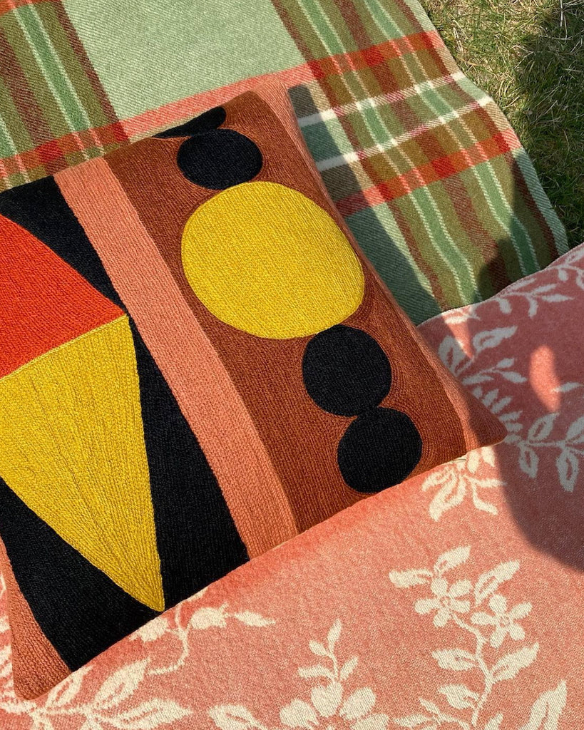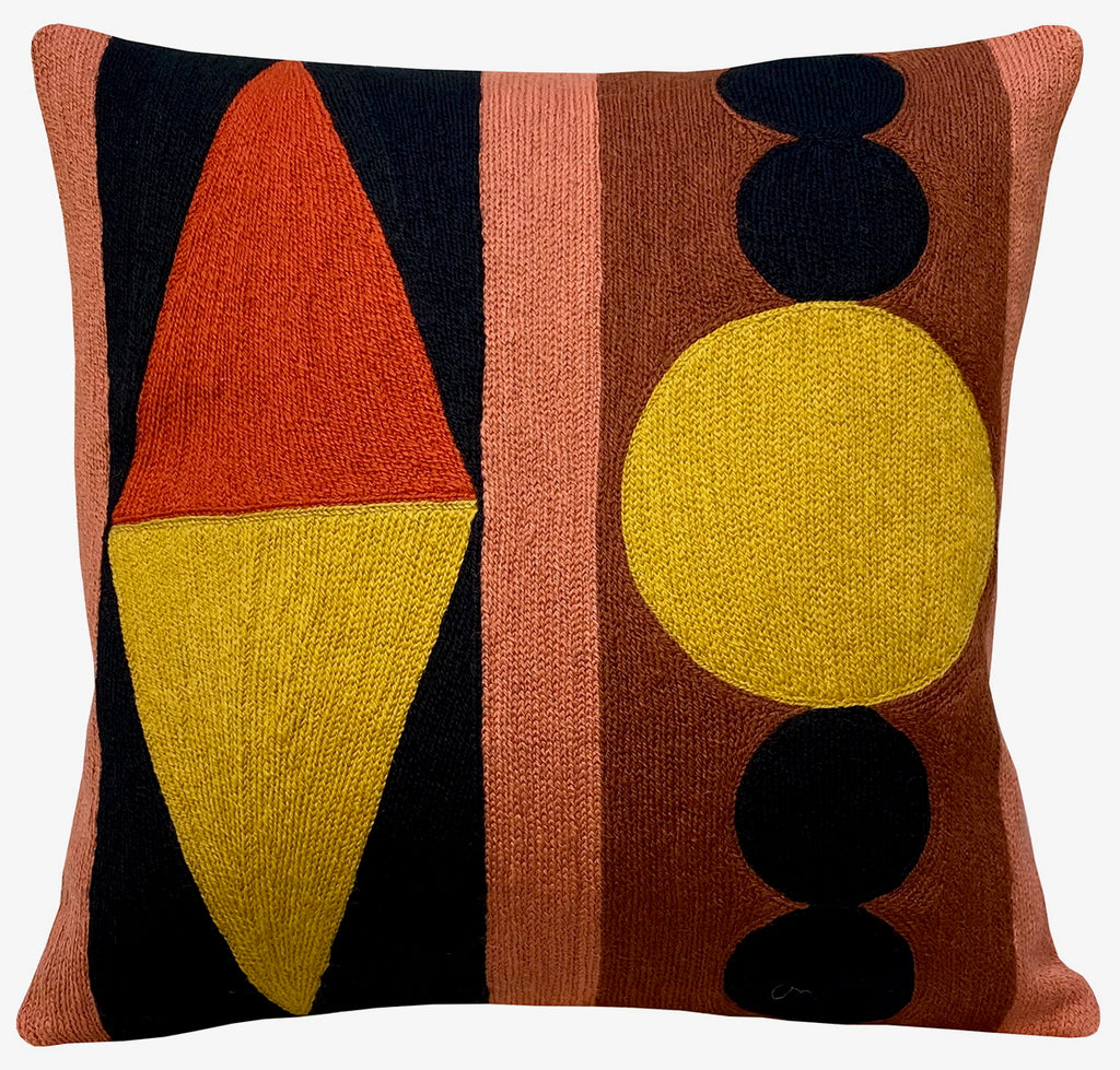 The Circus cushion features a vibrant, hand-embroidered geometric design, crafted over several days by skilled artisans. A joyful, refined accent for any interior.