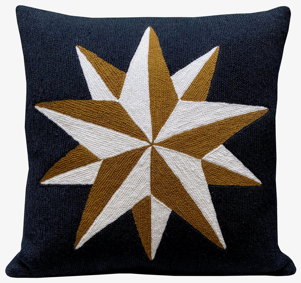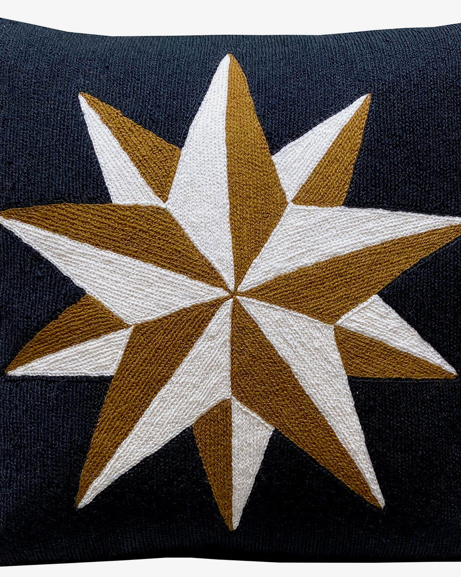 The Estelle cushion is an iconic design featuring a nautical star. Entirely hand-embroidered in chain stitch, an Estelle cushion requires 3-4 days of hand embroidery. Available in Blue, Black or Mustard Yellow.