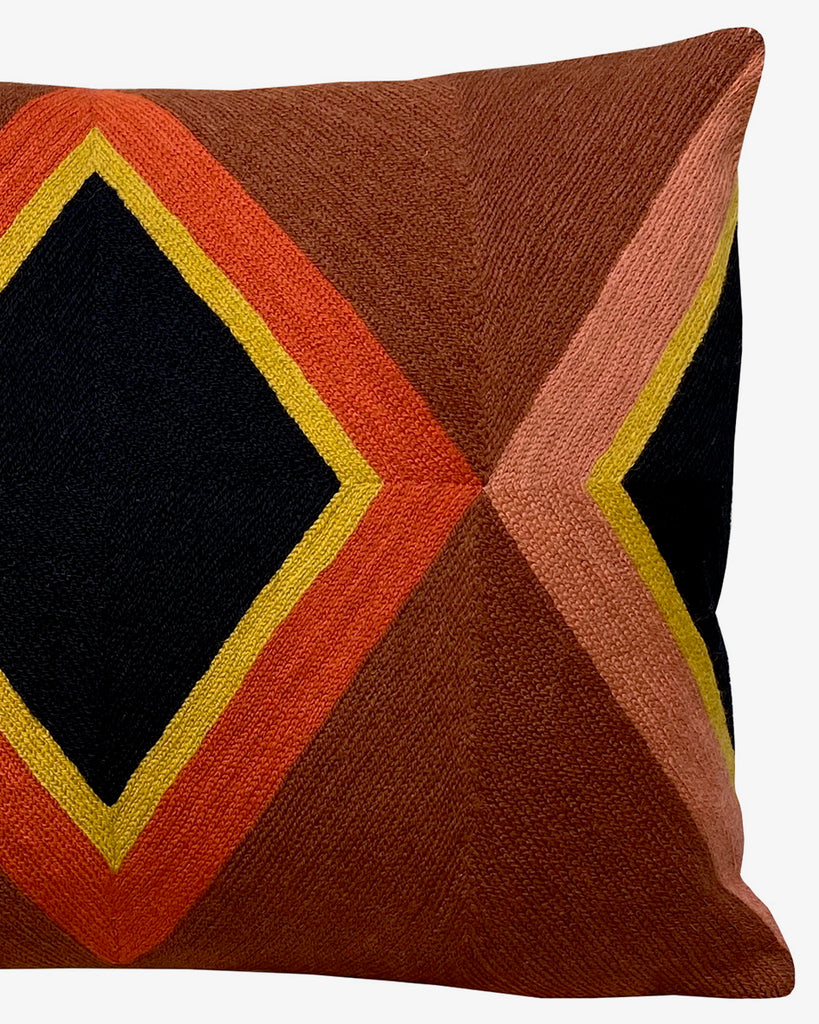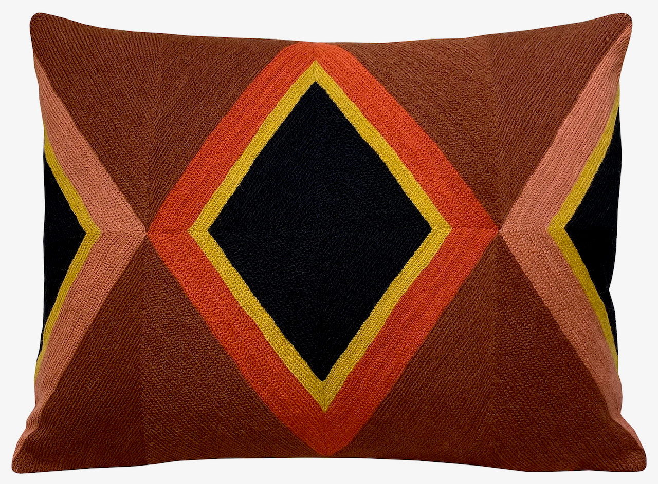 The RIVIERA cushion features a striking geometric diamond design, hand-embroidered in chain stitch by skilled artisans over four days. A colorful, handcrafted accent that brings elegance and texture to any interior.