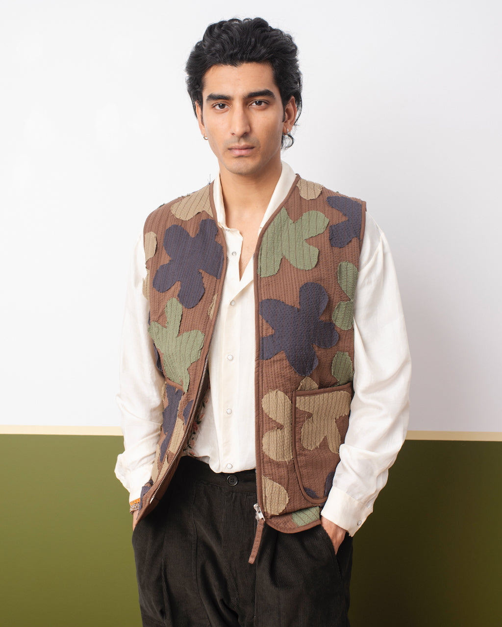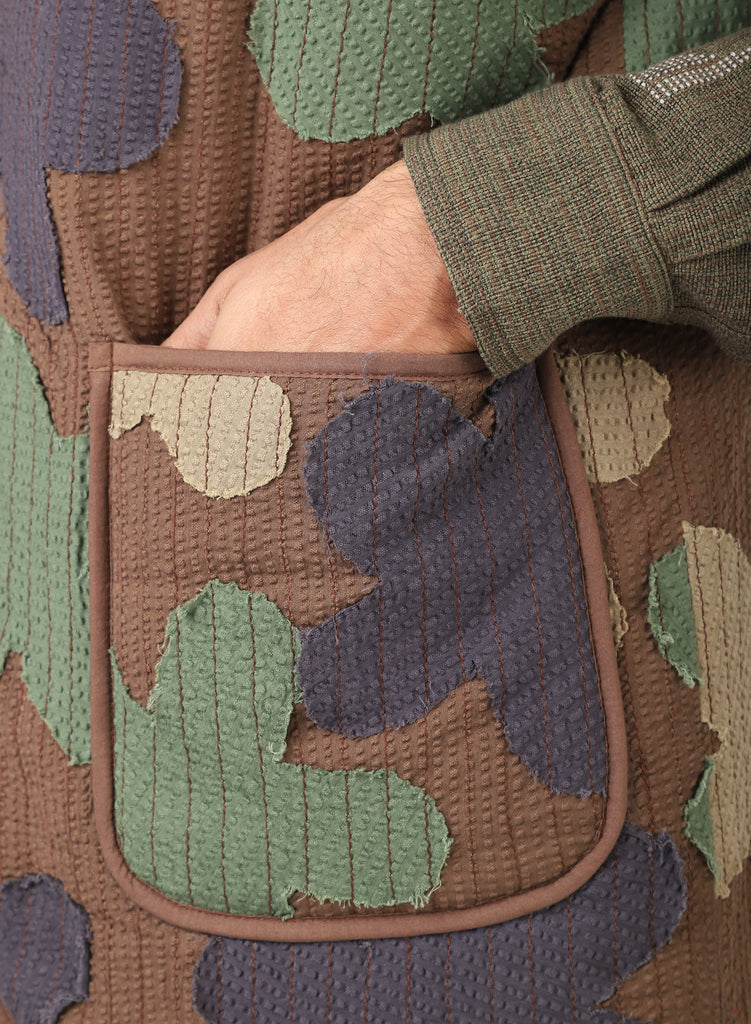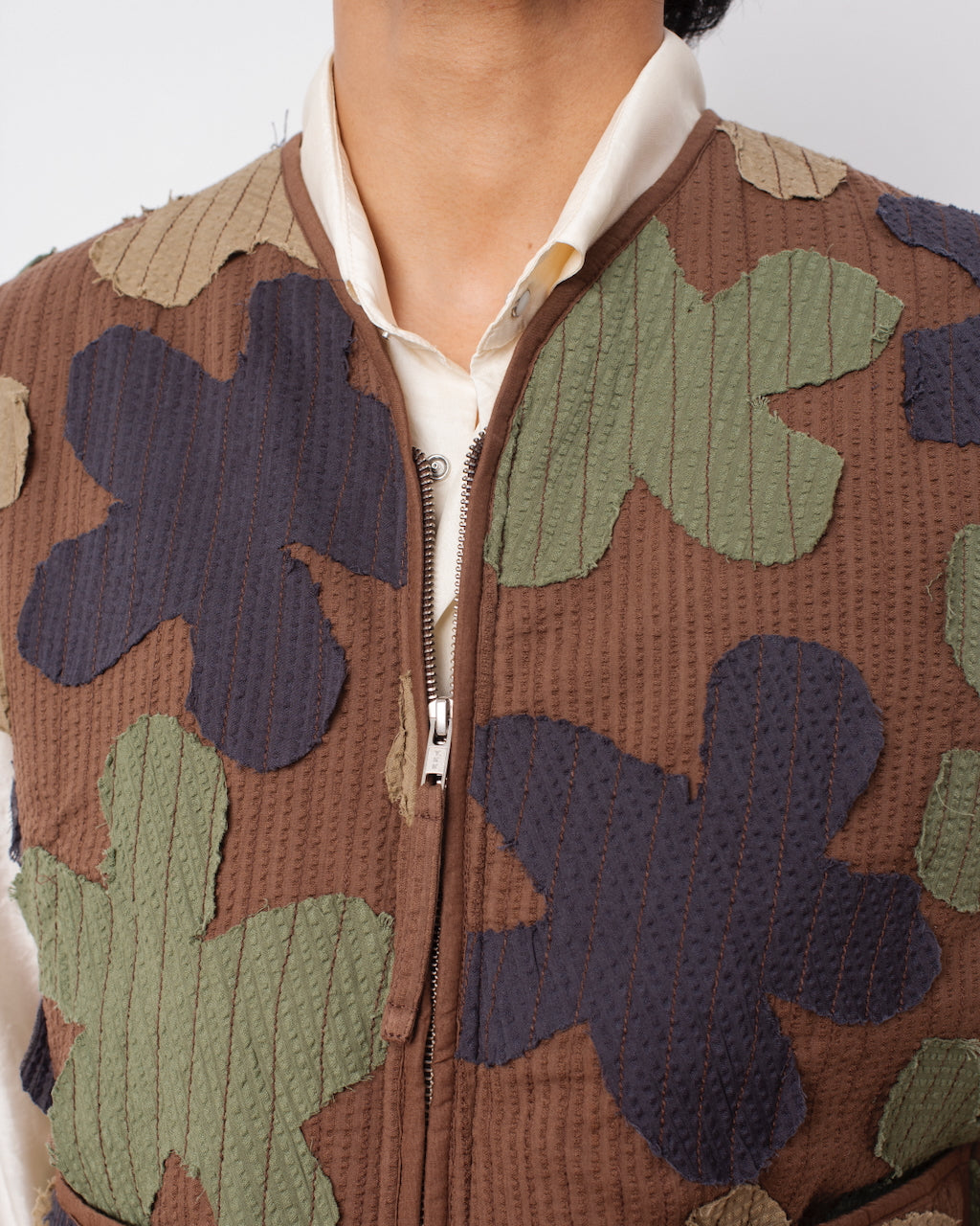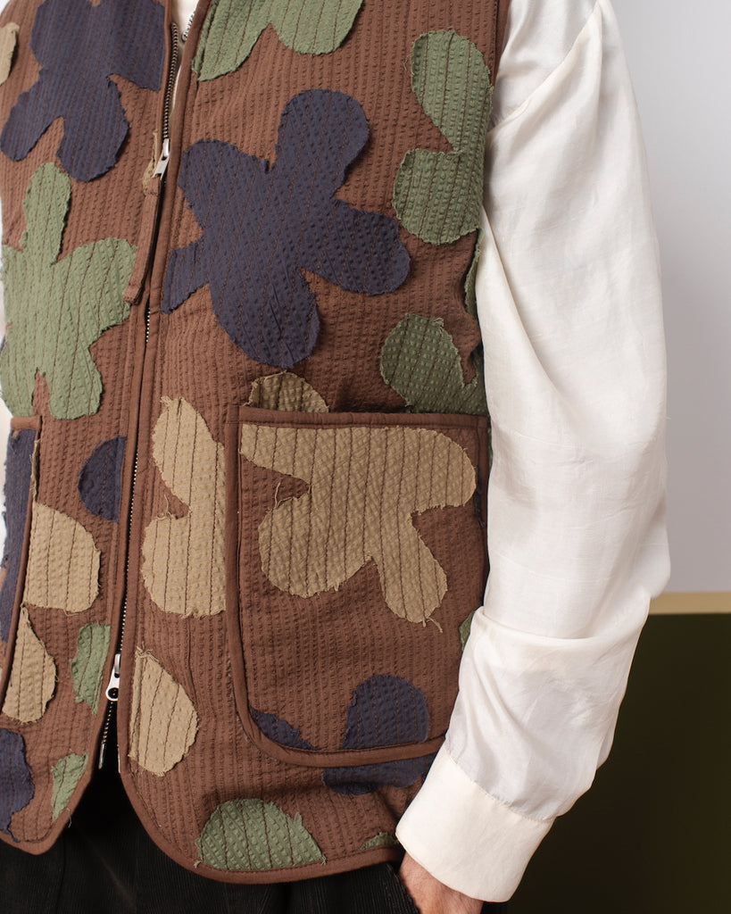 Statement quilted floral camouflage vest in upcycled cotton with stand-up collar.