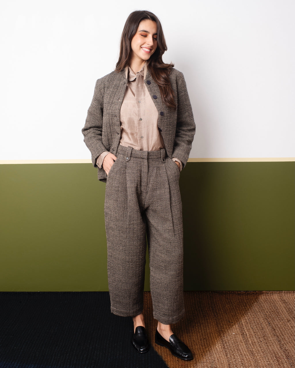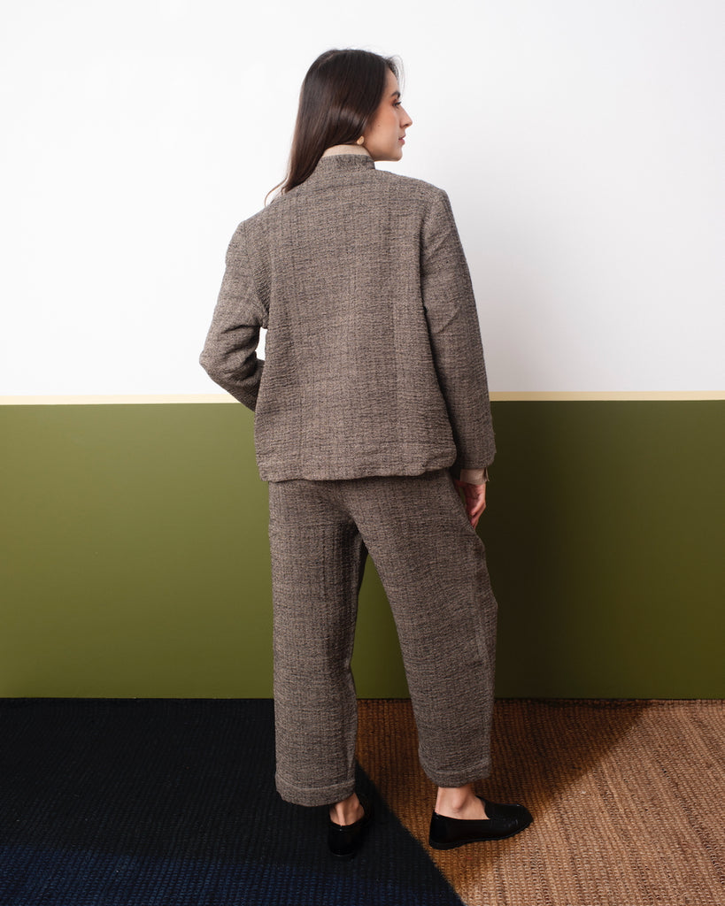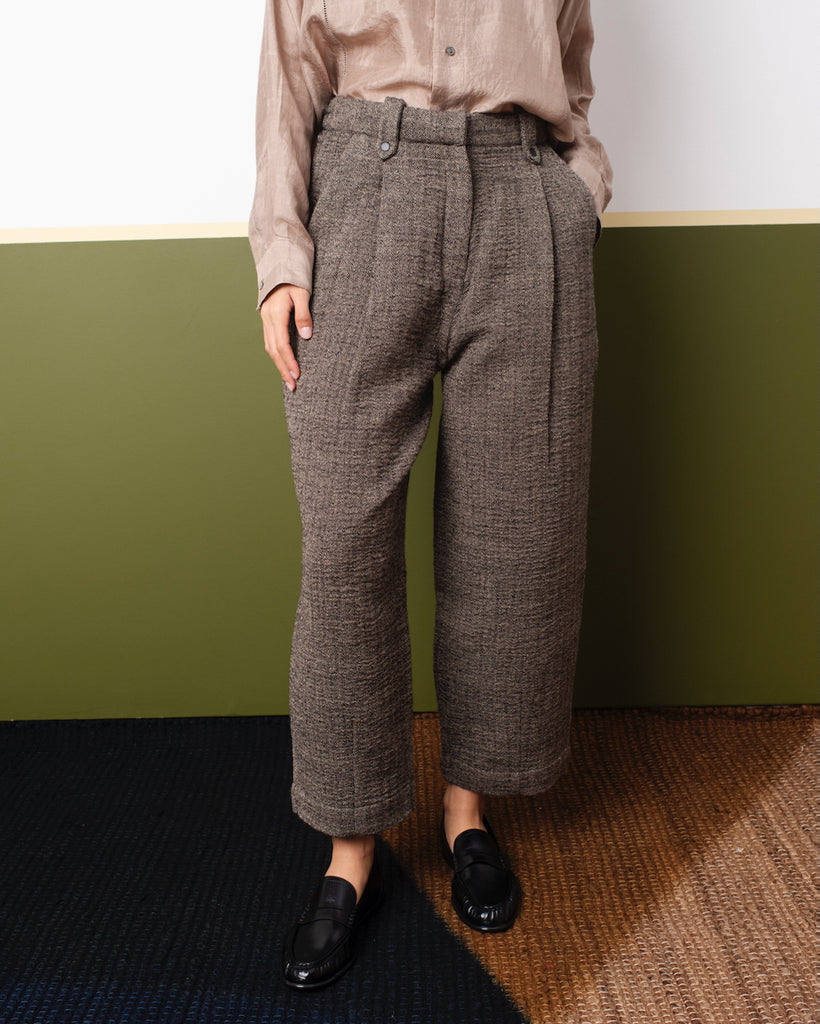 Soft pleated trousers in herringbone wool, cut for a timeless silhouette. Featuring side in-seam pockets, studded belt loops, and a discreet hook closure, these pants balance comfort and refinement. Handcrafted in India for effortless fall and winter layering.