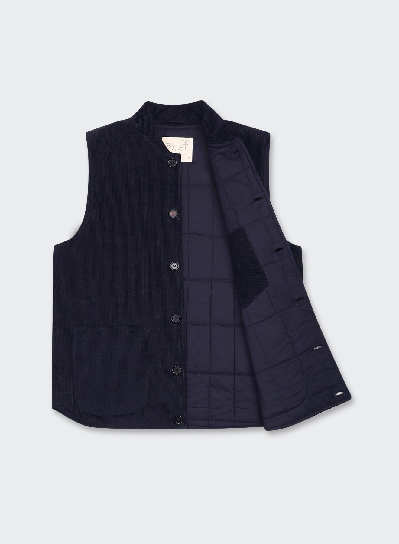 Stylish quilted corduroy vest in organic cotton with stand-up collar.