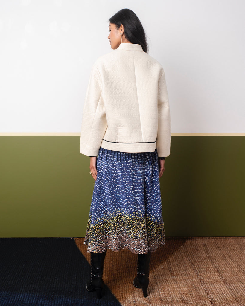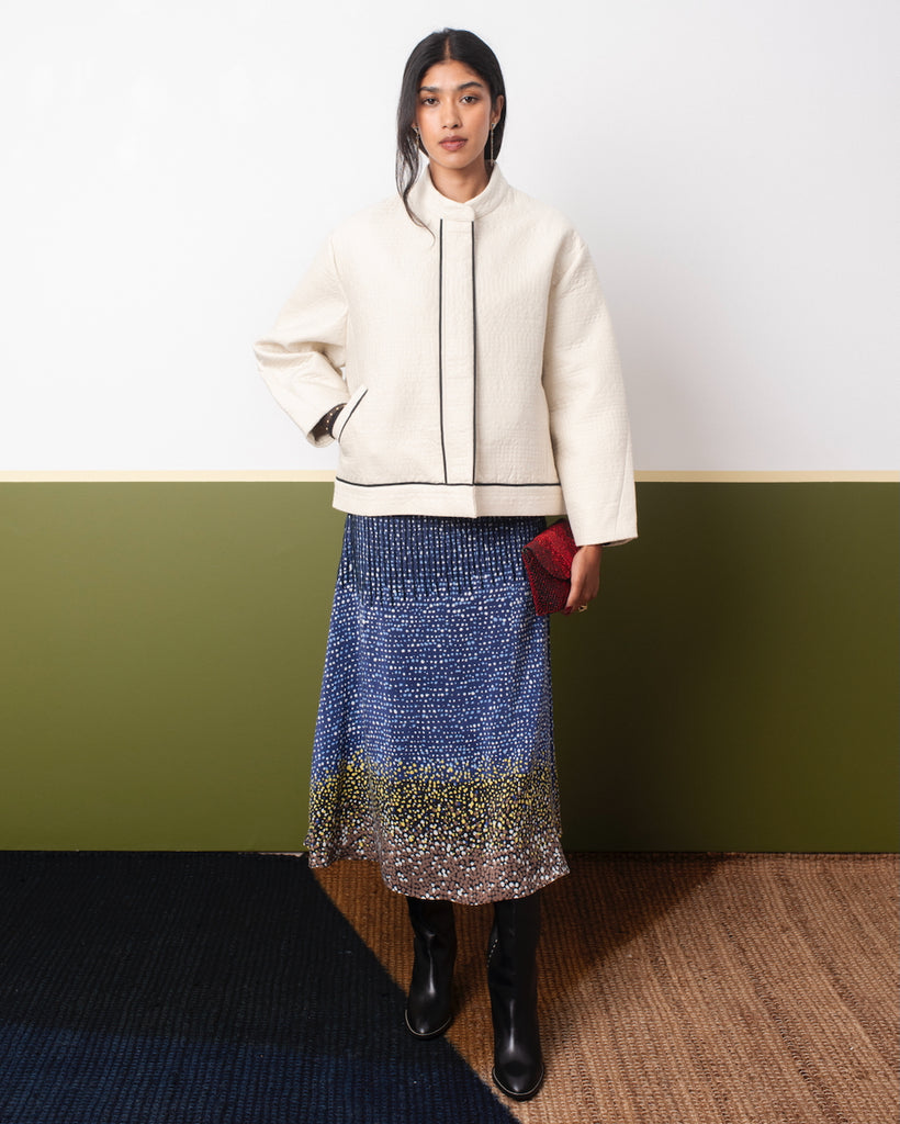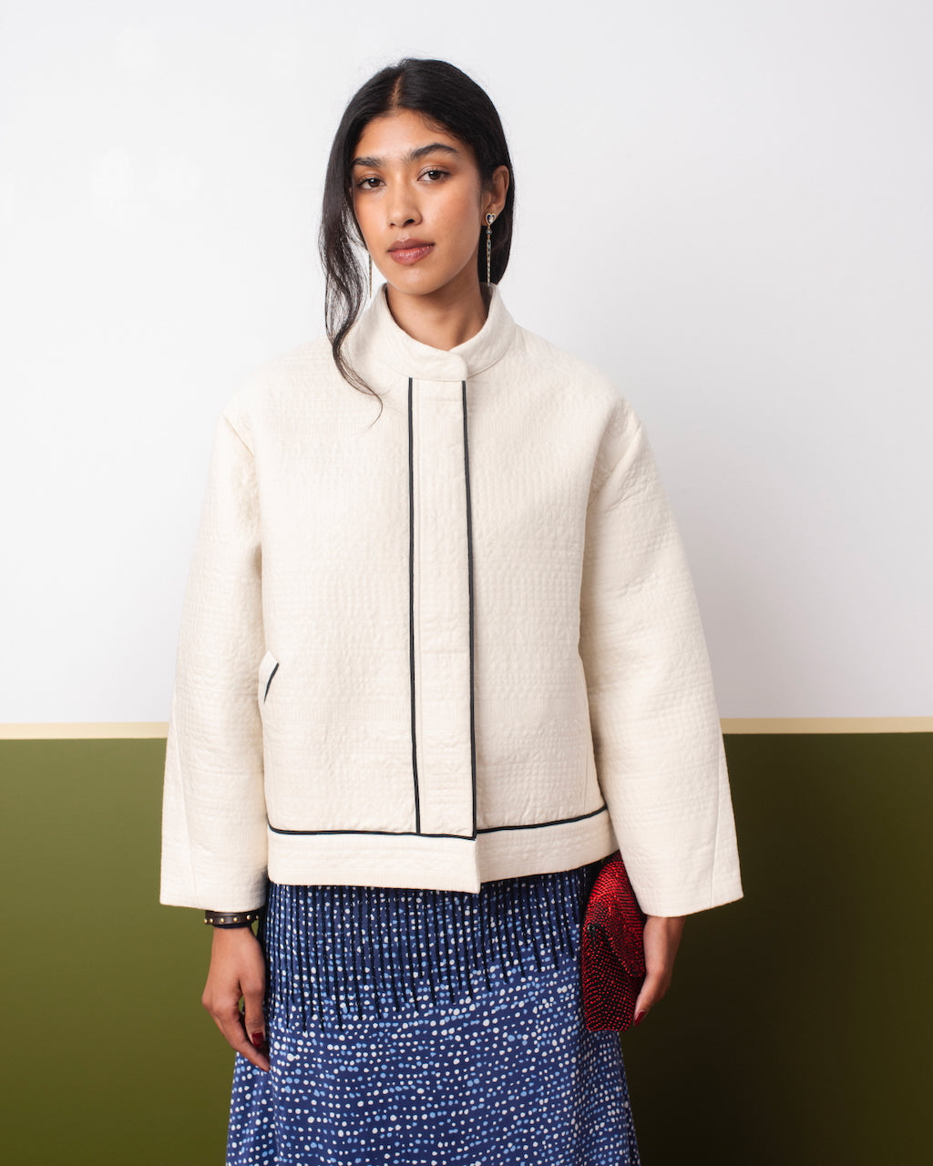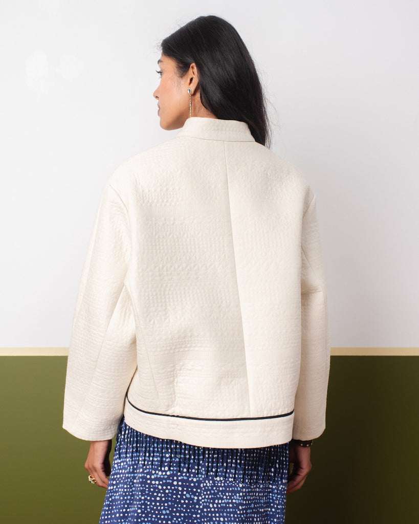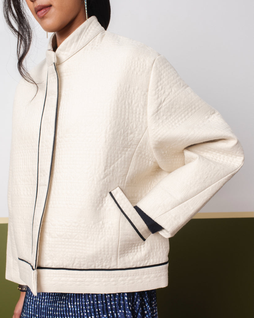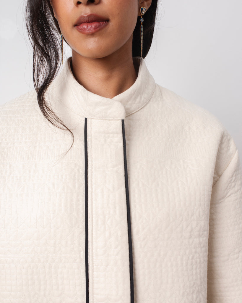 Oversized quilted off-white wool jacket with intricate abstract top-stitching.