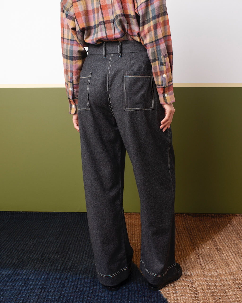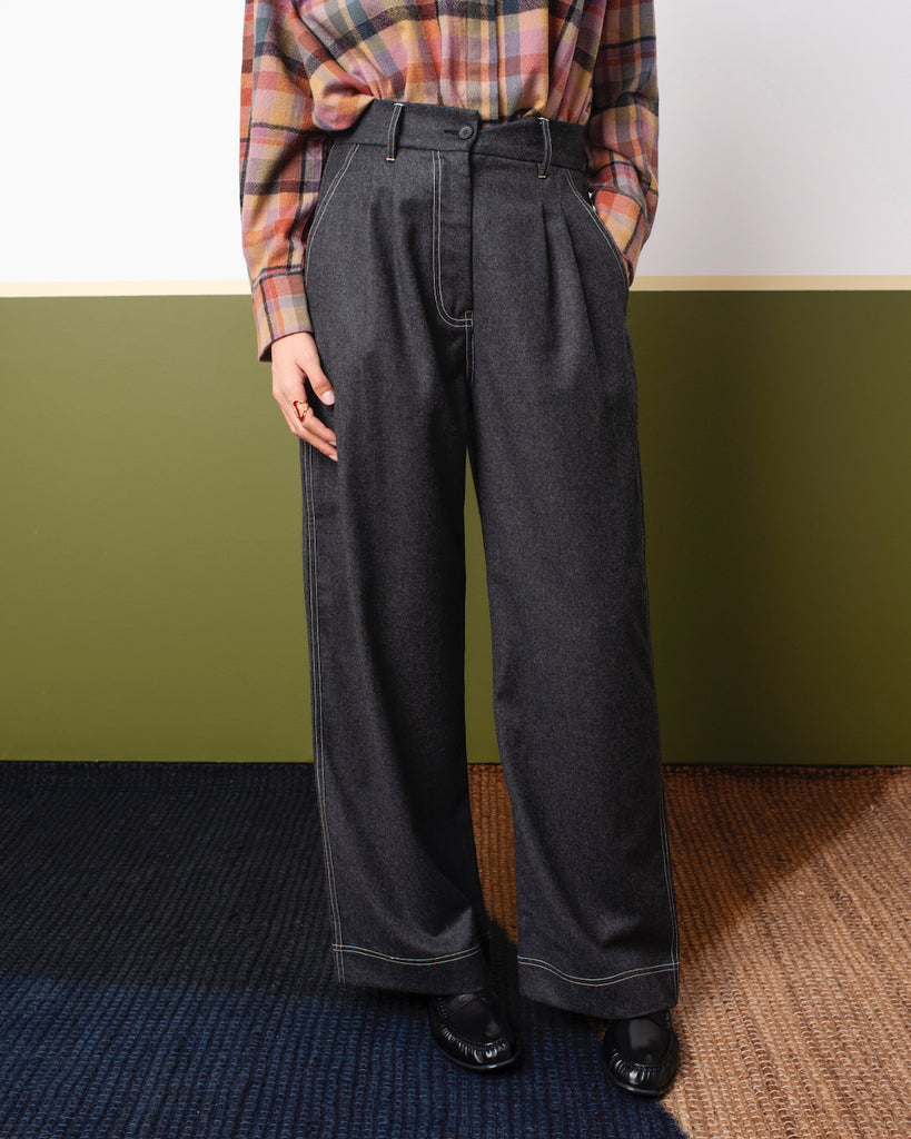 Miti soft wool pants with wide fit, high waist, and subtle contrast stitching.