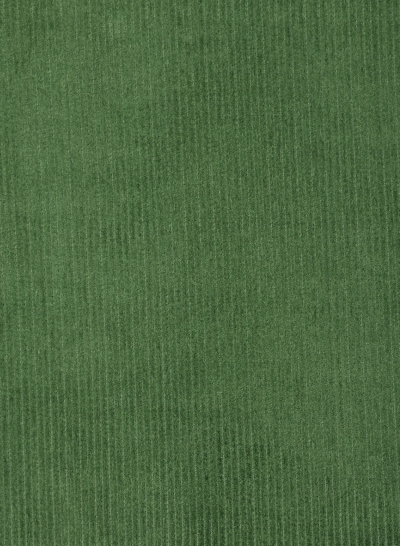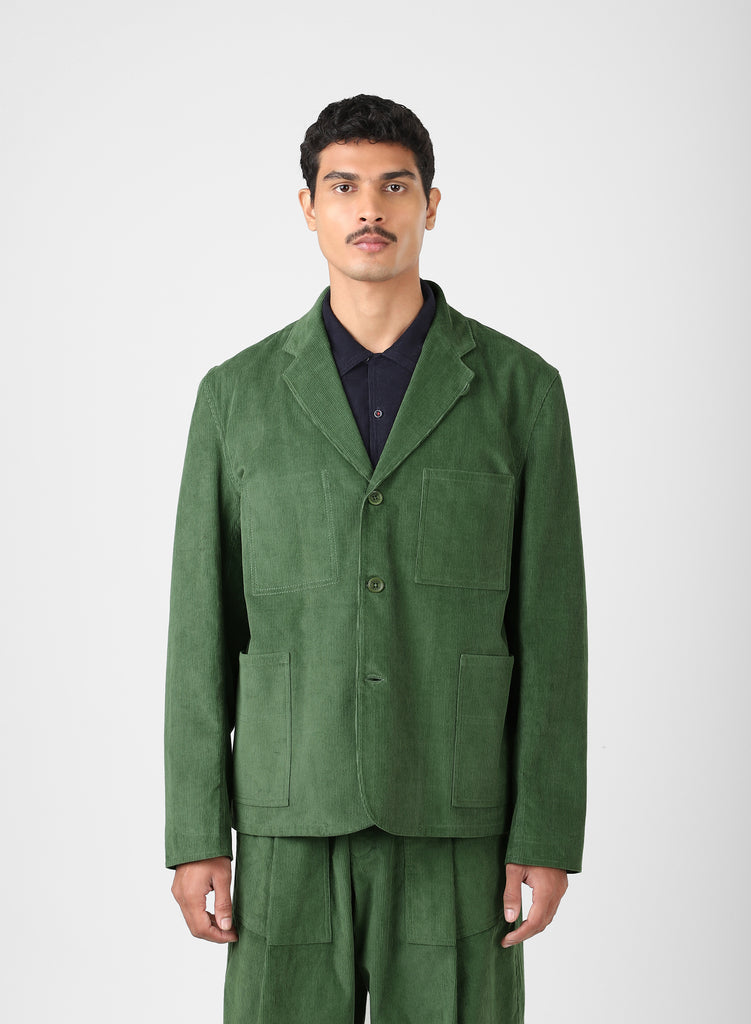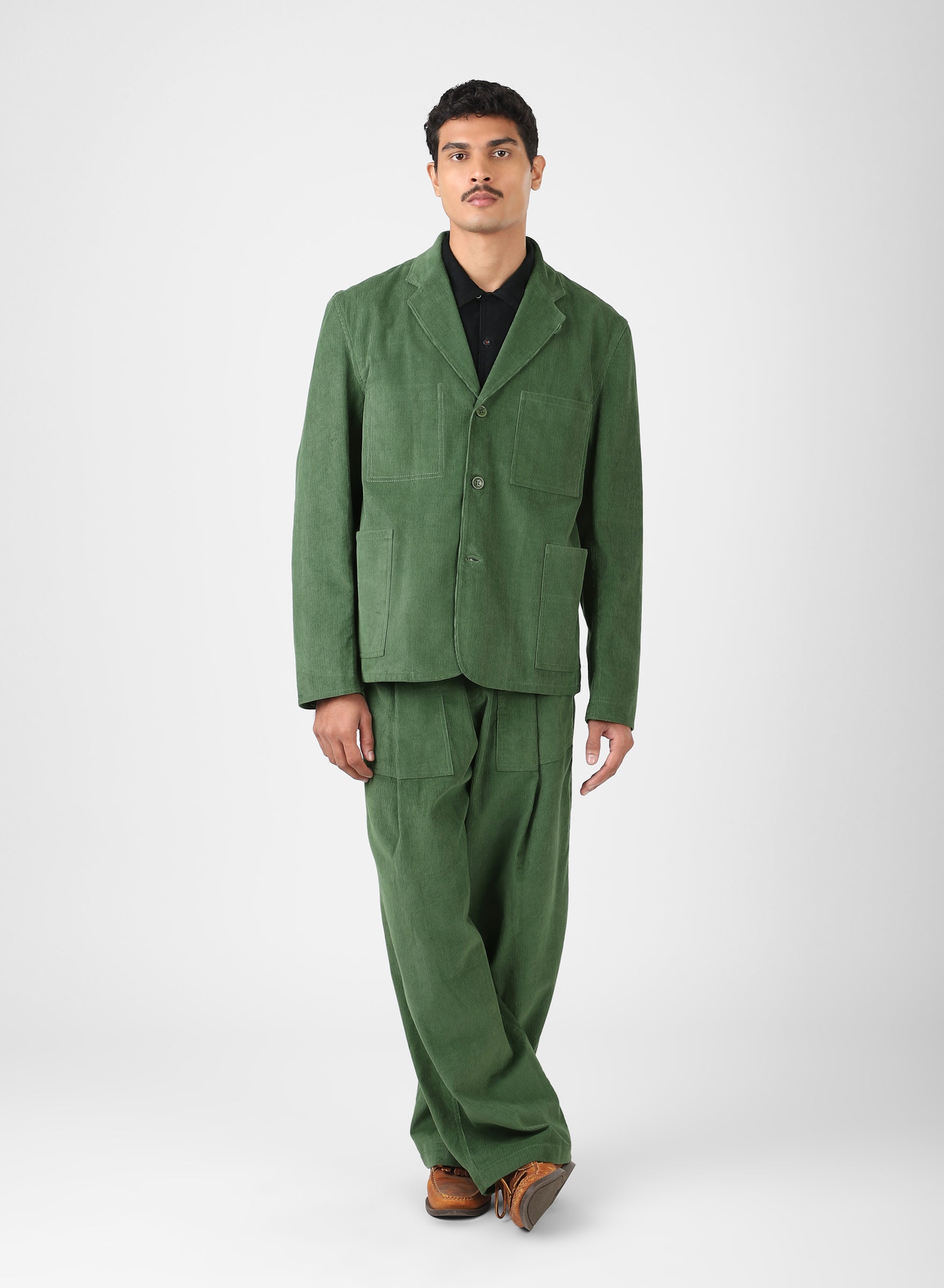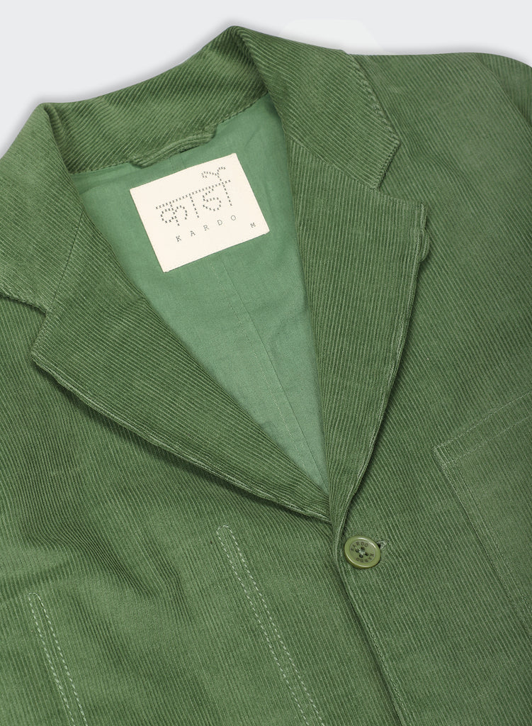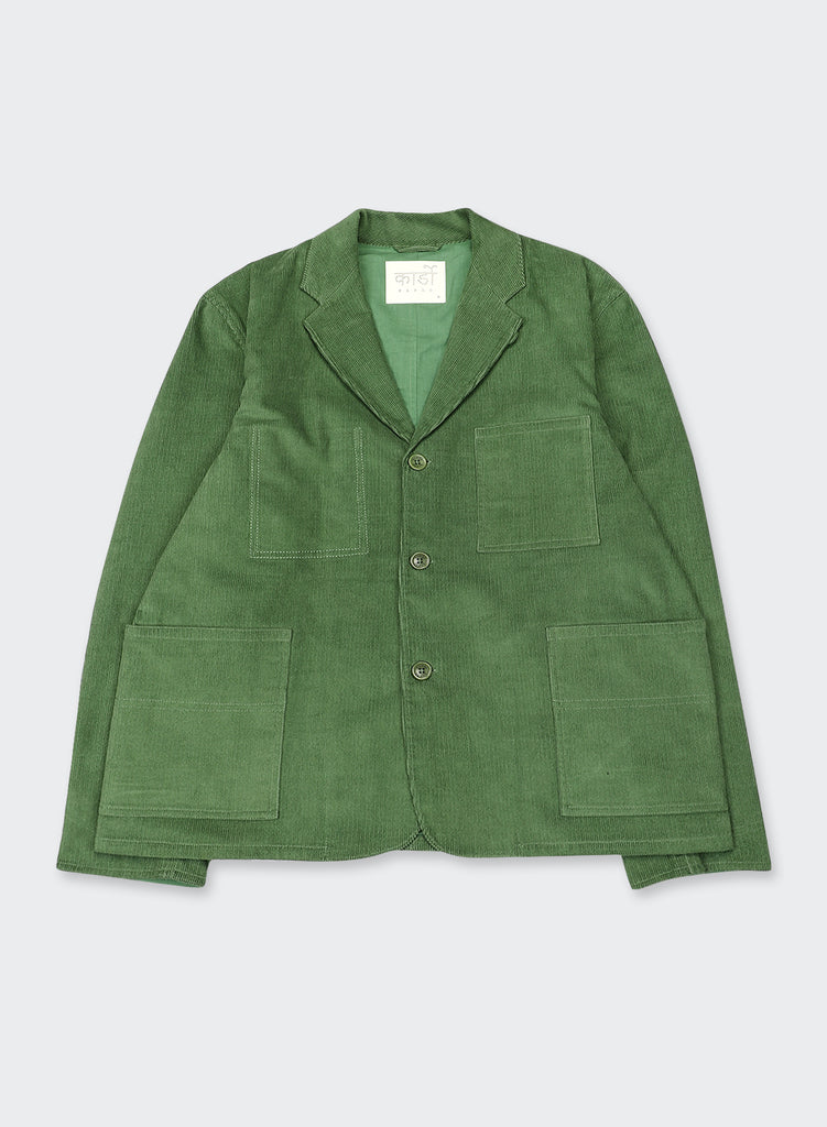 Corduroy three-button blazer with flat pockets and adjustable lapel closure.