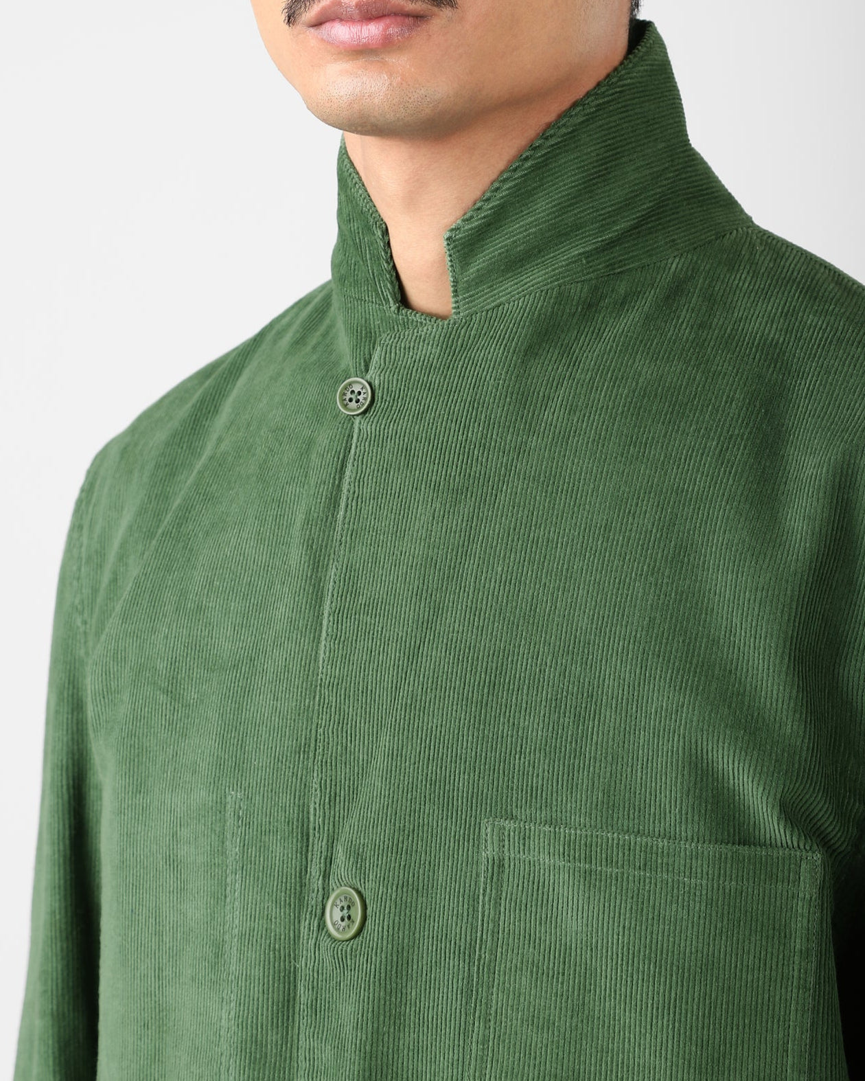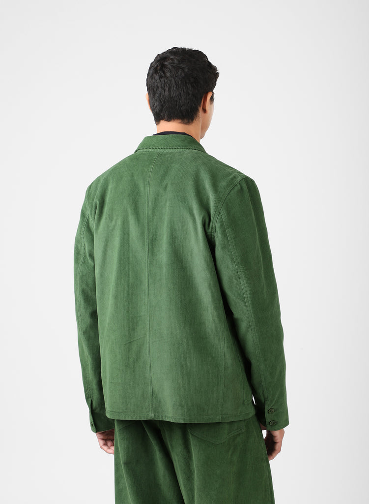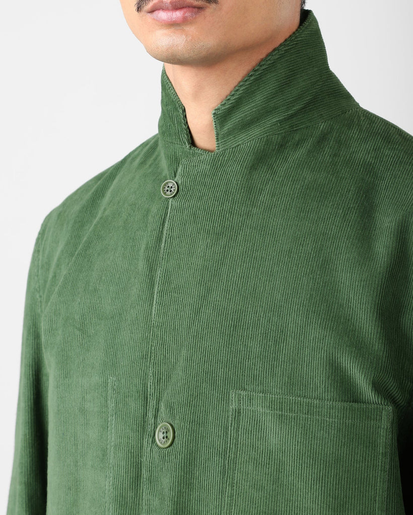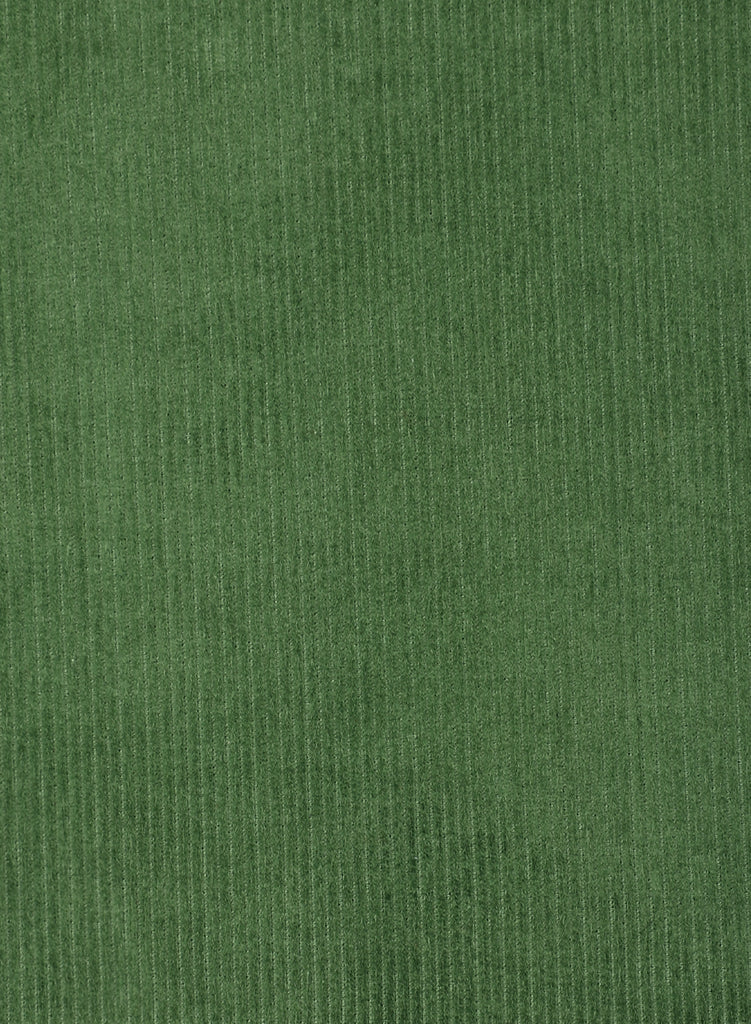 Corduroy three-button blazer with flat pockets and adjustable lapel closure.
