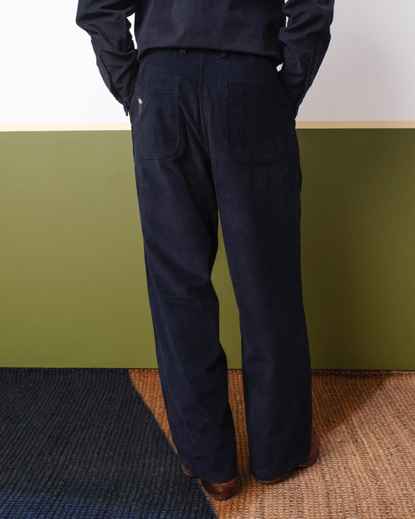 Oversized men’s corduroy trousers in organic cotton with pleats and patch pockets.