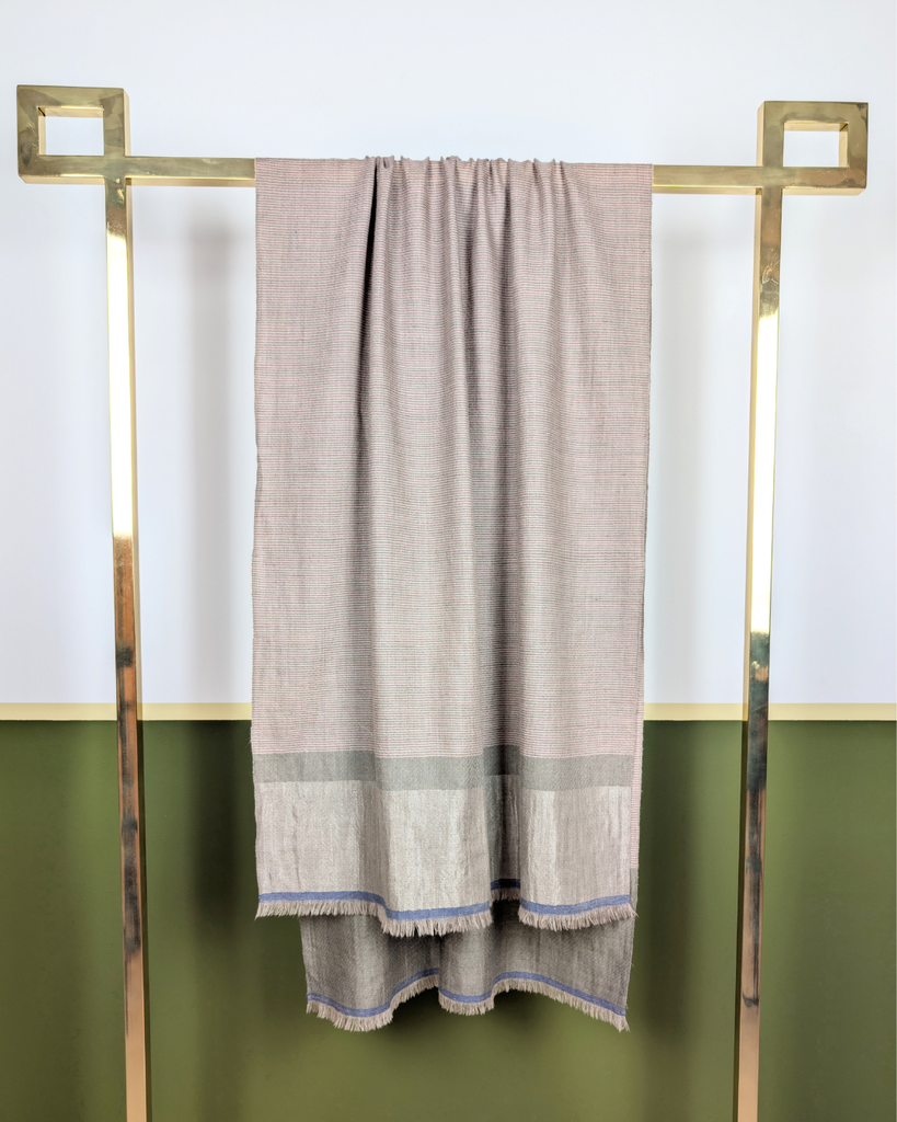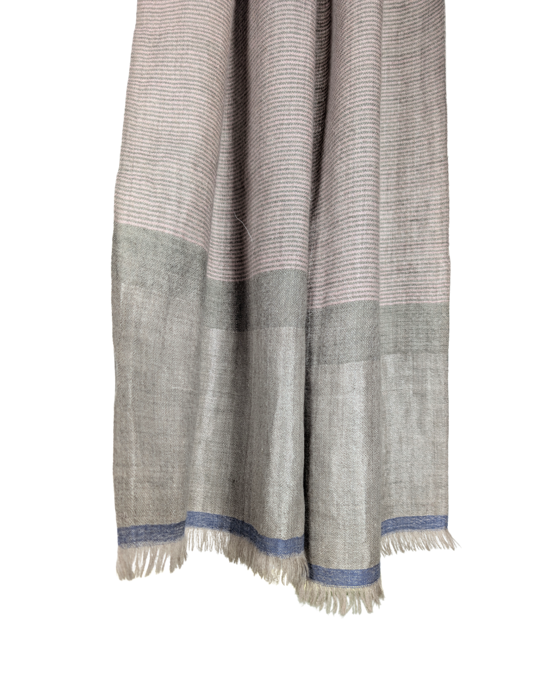 A luxurious stole in 95% pashmina and 5% metallic yarn, handspun and handwoven in Kashmir. Soft, warm, and subtly shimmering with fine stripes and a pop of edge color - an elegant accessory for all seasons.