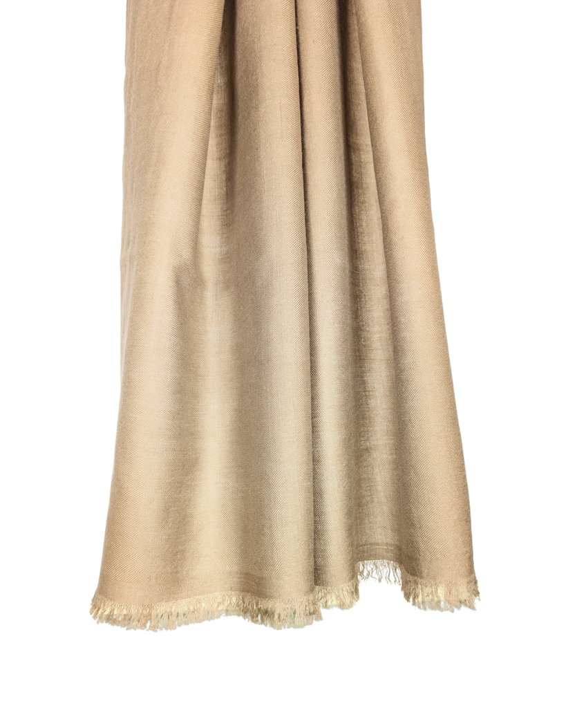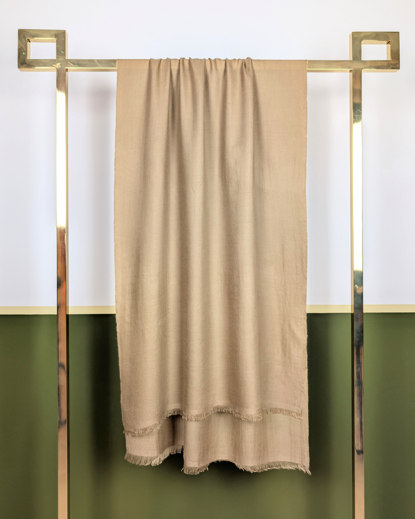 A classic scarf in 100% cashmere, handspun and handwoven in Kashmir. Soft, lightweight, and finished in a baby camel tone - a refined, slow fashion essential.