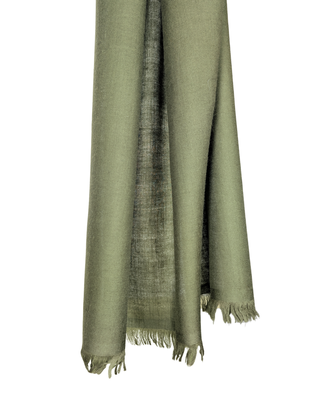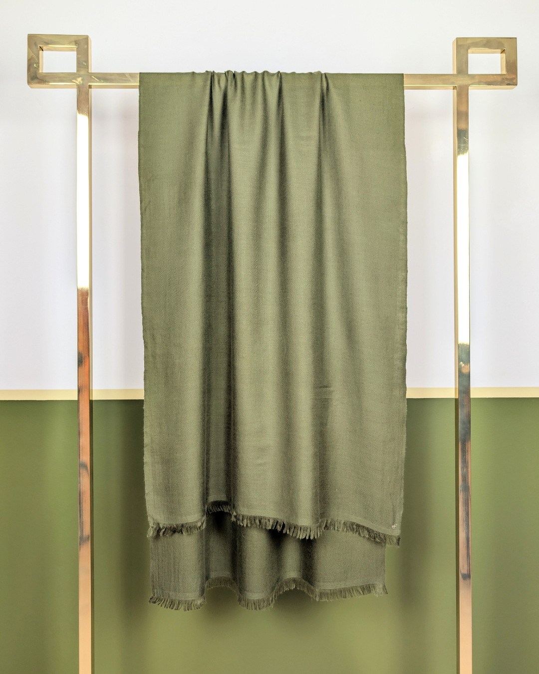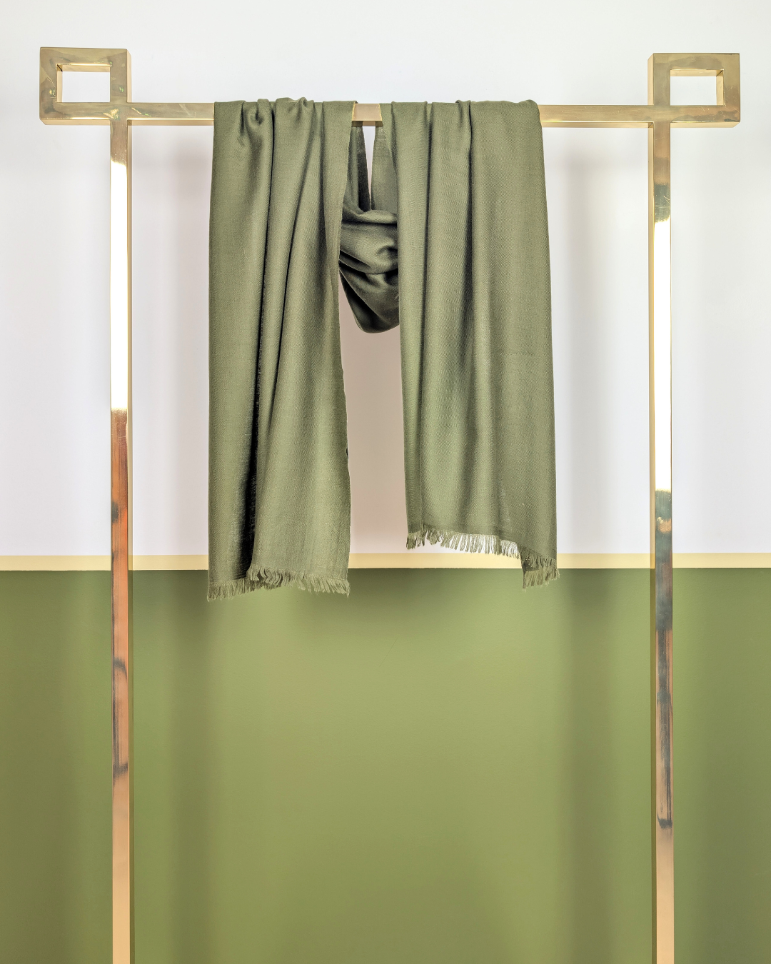 A classic scarf in 100% cashmere, handspun and handwoven in Kashmir. Soft, lightweight, and finished in a rich Khaki Green hue - a timeless, slow fashion essential.