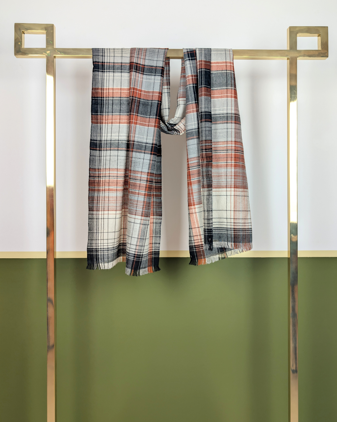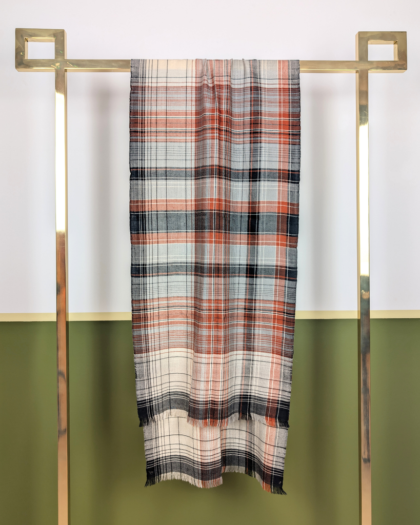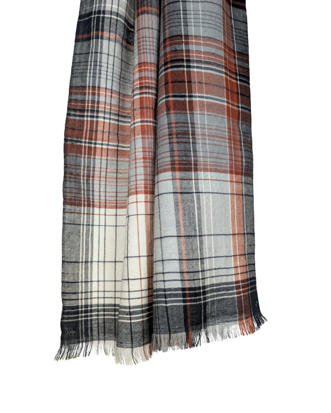 A 100% pashmina shawl, handspun and handwoven in Kashmir. Organic plaid in warm Emberstone tones, woven from leftover yarn for a sustainable touch. Soft, airy, and unique - a slow fashion classic.