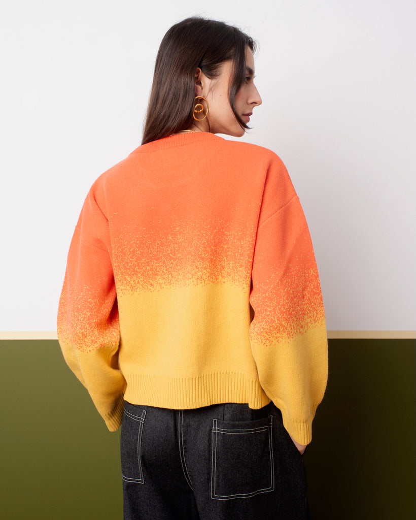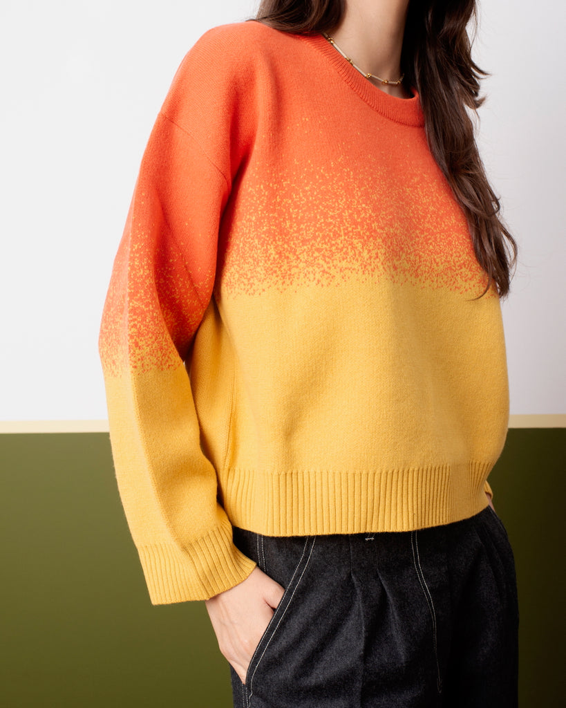 Wool–cashmere jacquard jumper in fire orange fading into yellow.