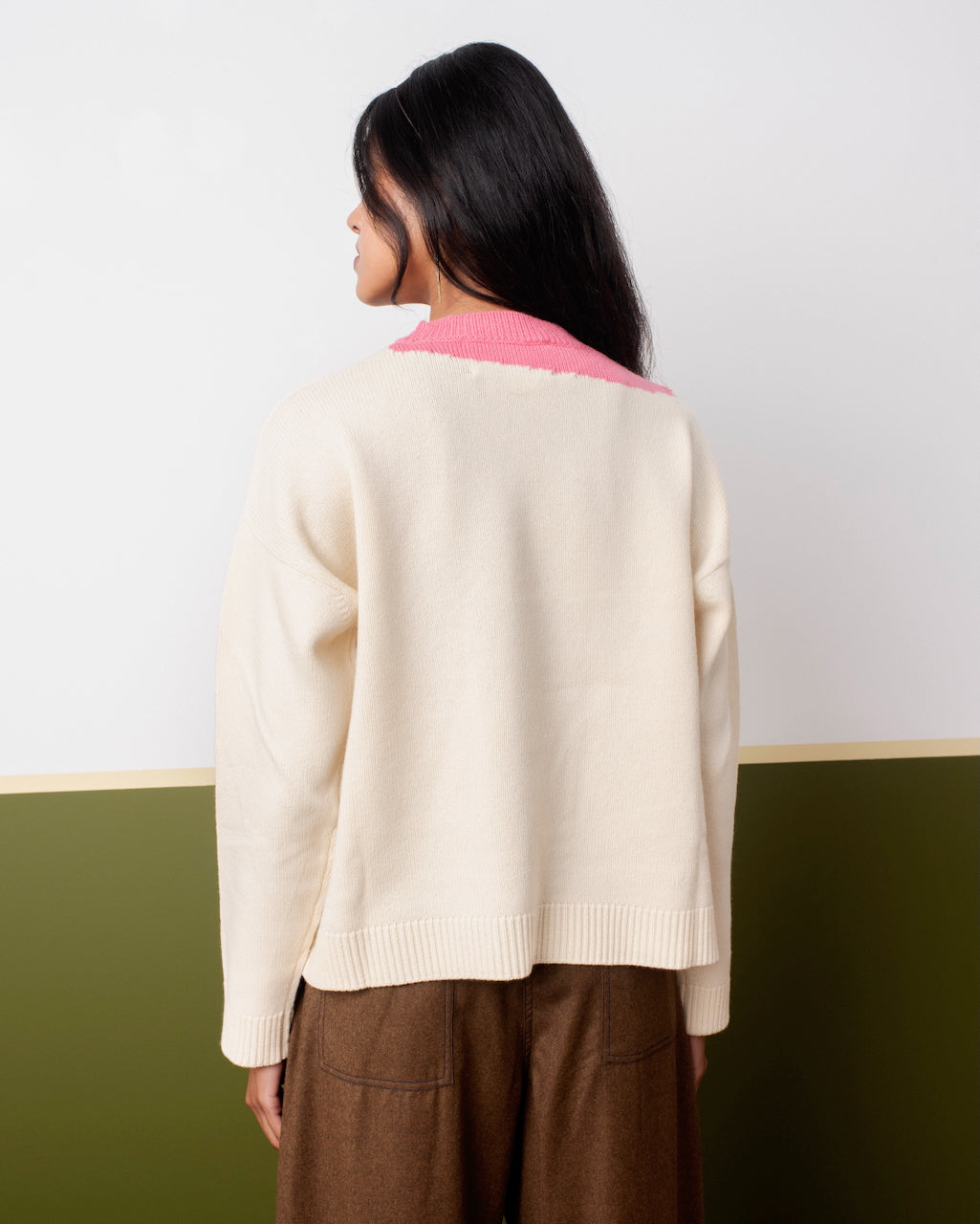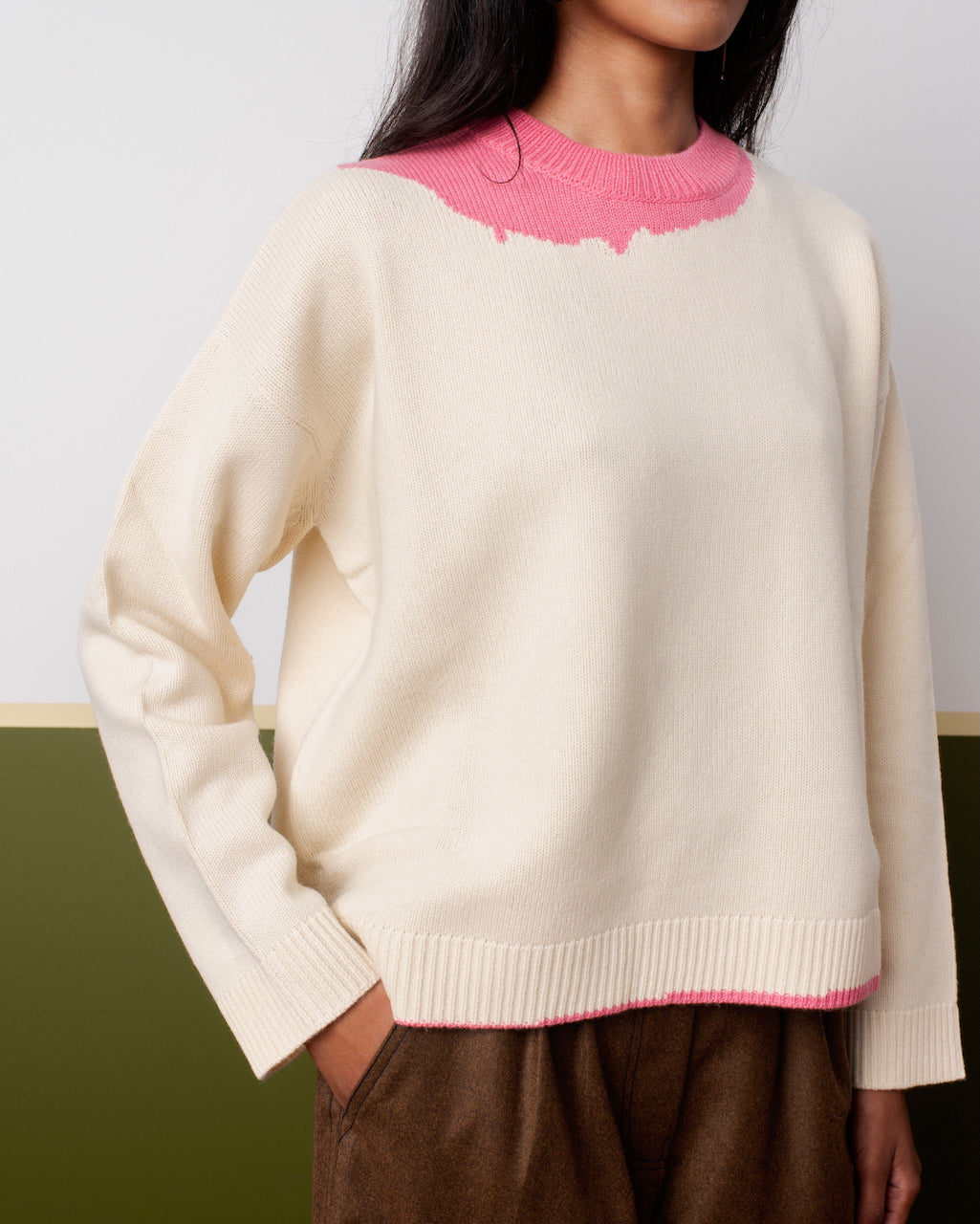 Gerda sweater in wool-cashmere with asymmetrical jacquard details at the collar and at the hem.