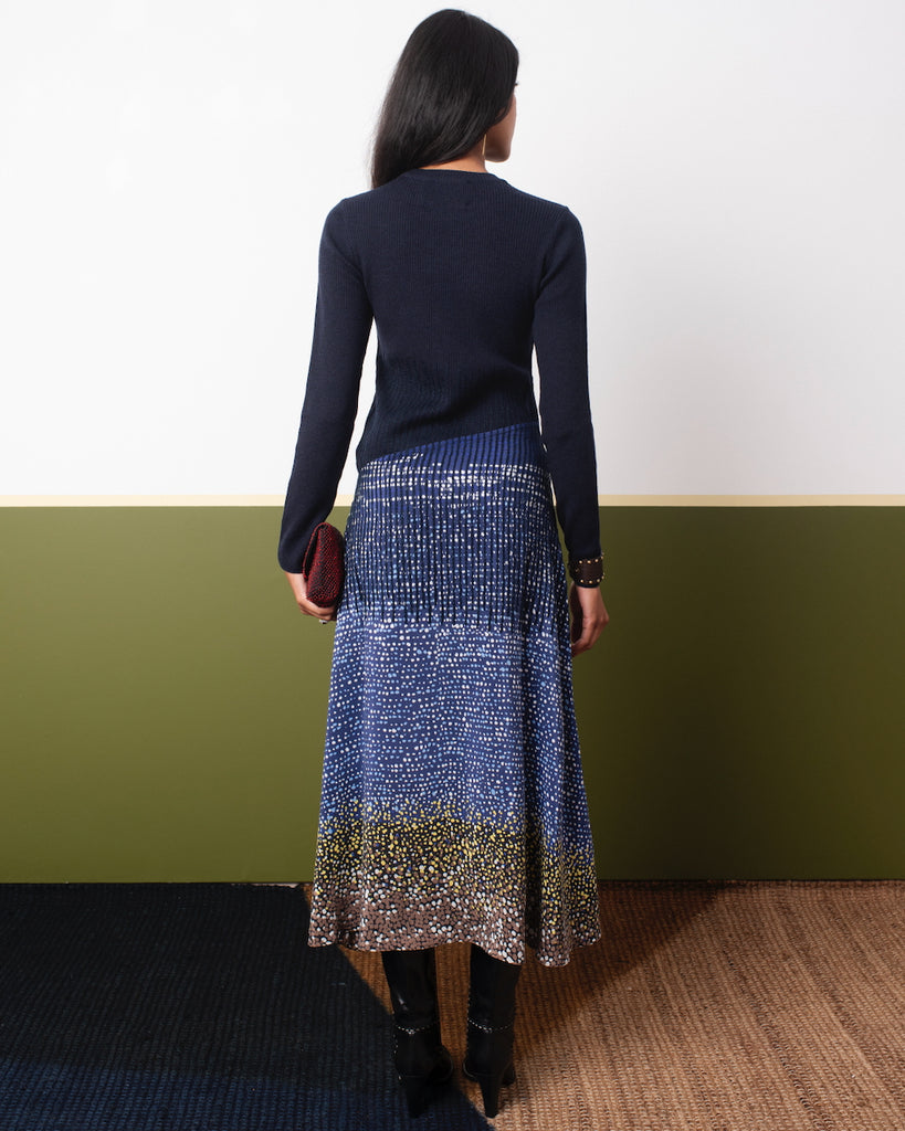 Fitted statement long-sleeve dress in navy wool blending into a silk bottom inspired by impressionist painting.
