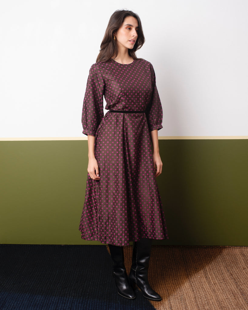 Lightweight hand block-printed silk dress with pink dots, featuring a round neck with back button closure, 3/4 sleeves, and hidden side pockets. Effortlessly wearable. Belt not included.