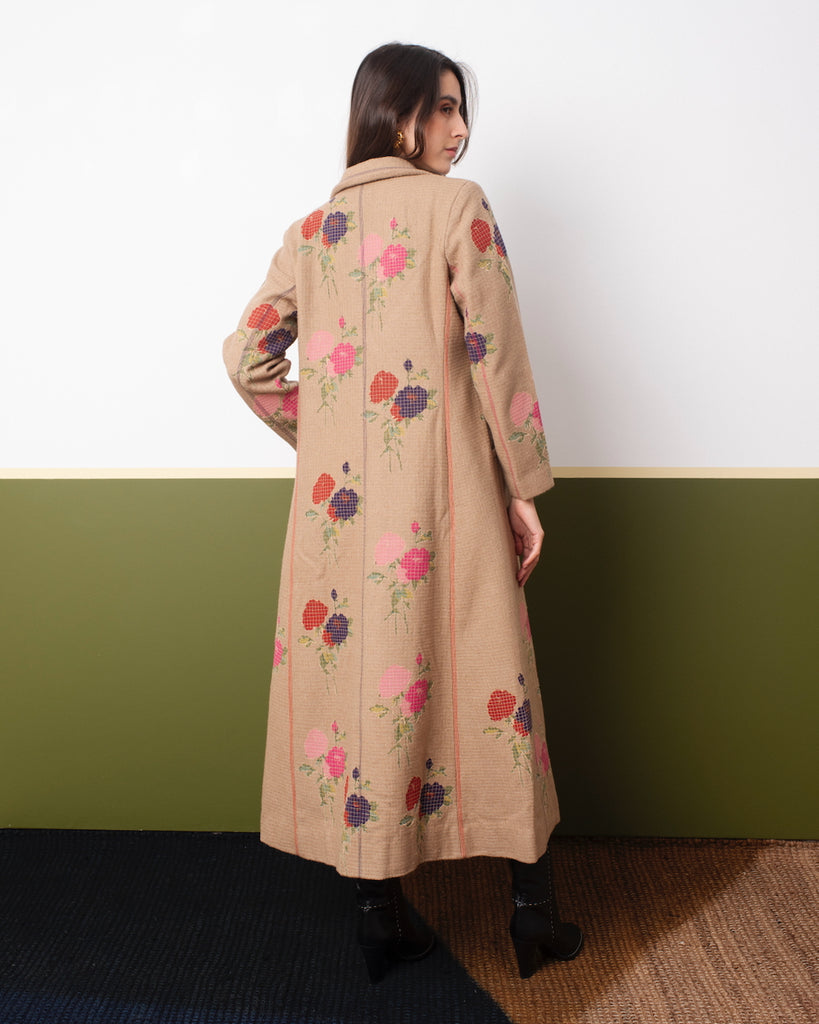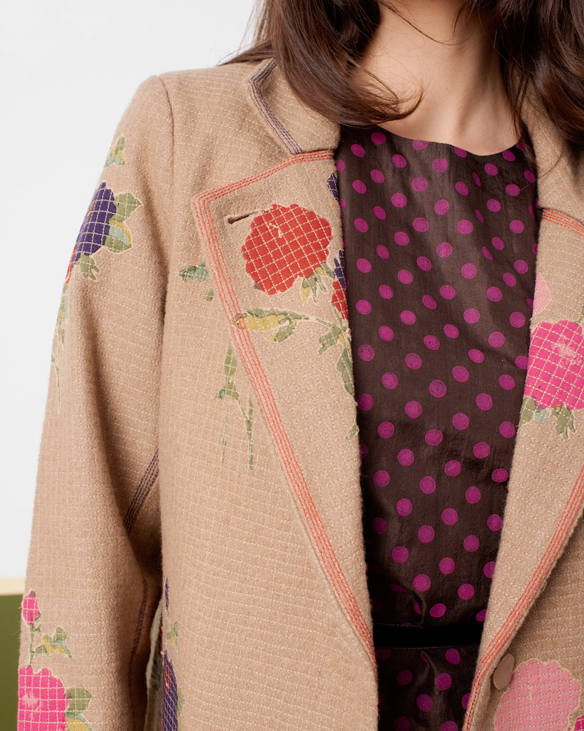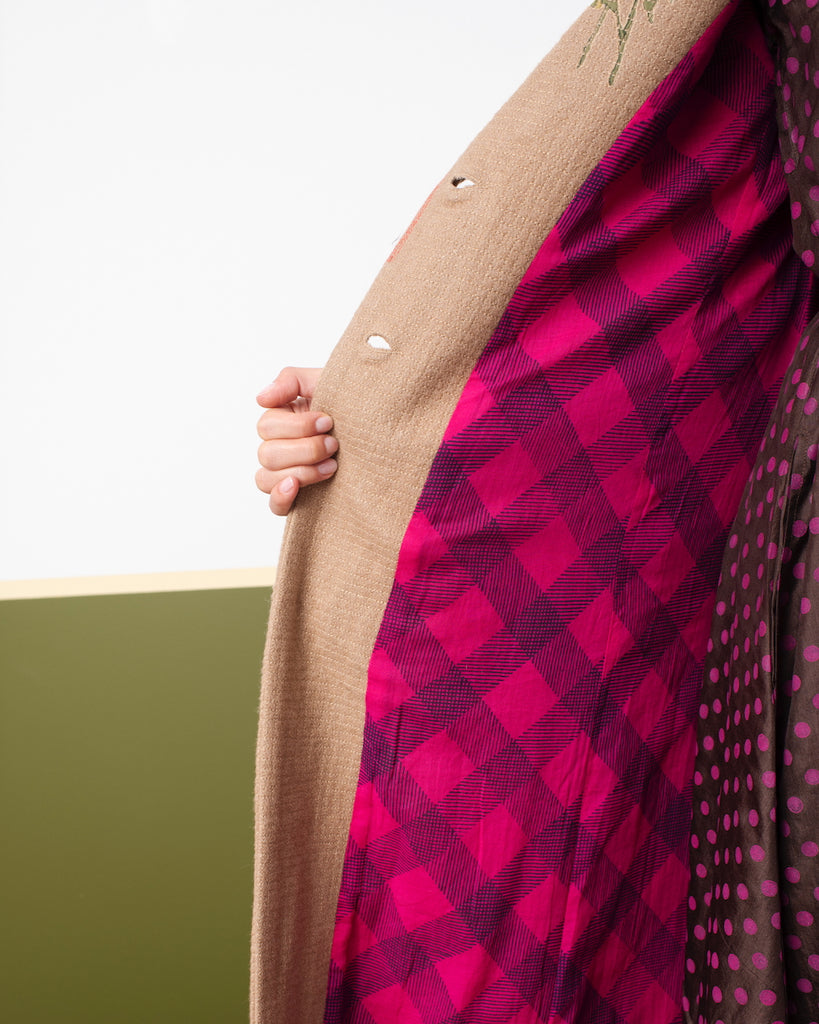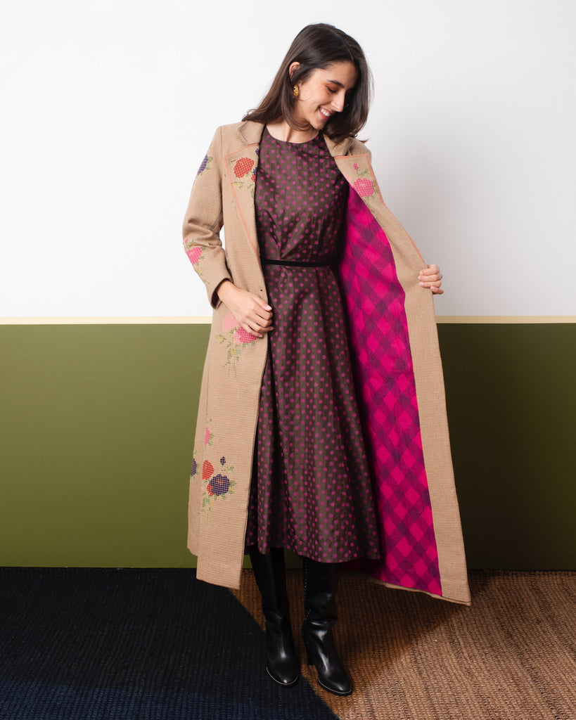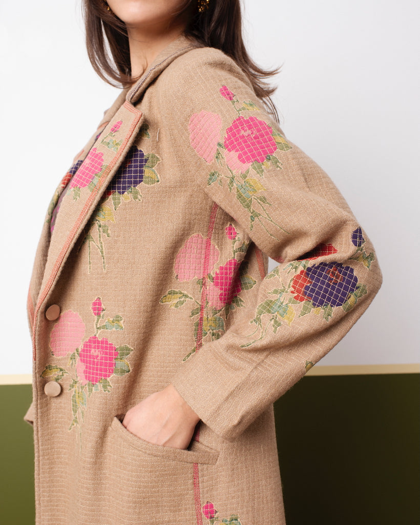 Long beige wool winter coat with structured lapels, hand-block print & appliqué, side pockets. Fully lined in vibrant pink and purple block print silk. Crafted for warmth, comfort, style and standout seasonal layering.