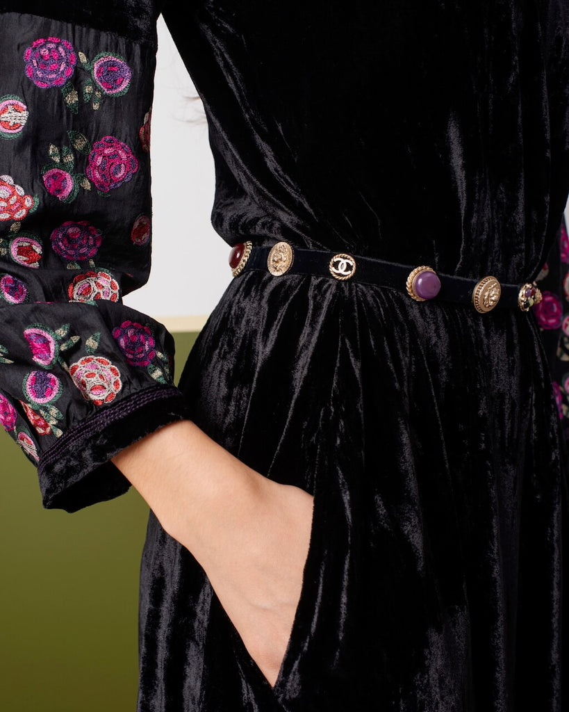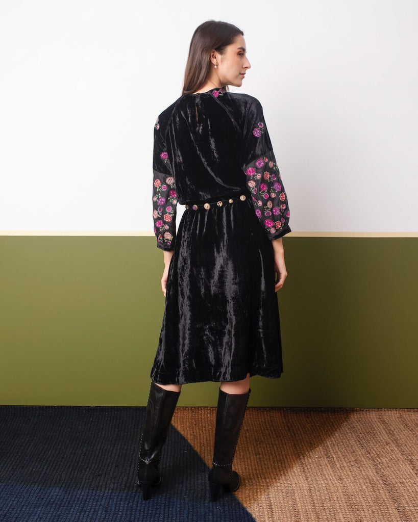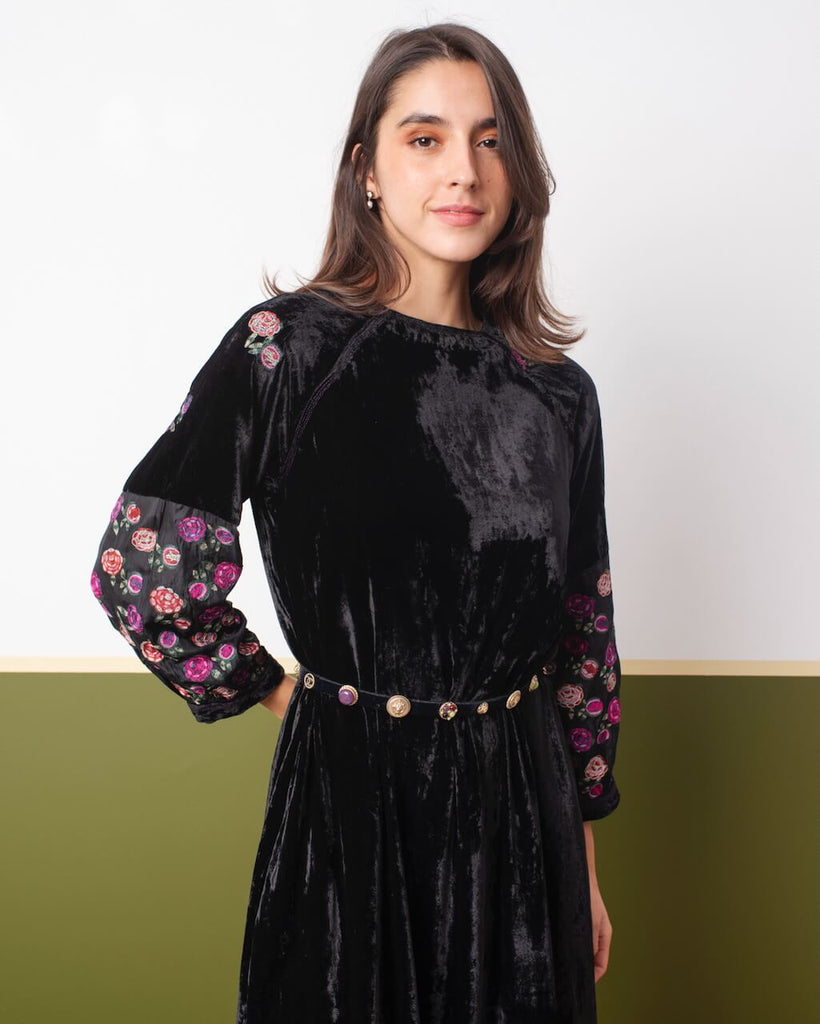A black velvet dress that features delicate embroidery on the 3/4 sleeves, side pockets, and a matching belt to define the waist. Soft, elegant and timeless - perfect for winter.