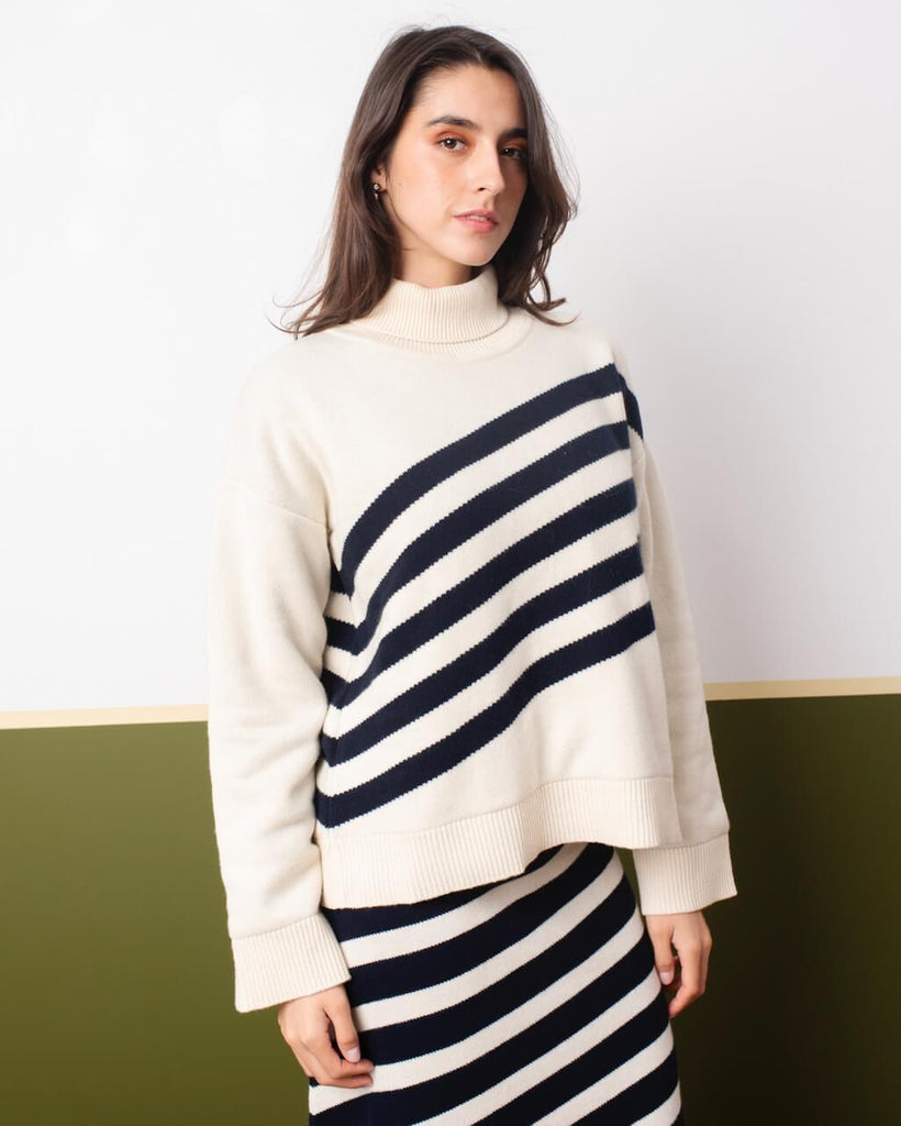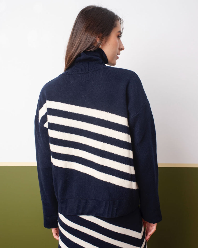 Mélanie wool-cashmere sweater with diagonal stripes and high collar.