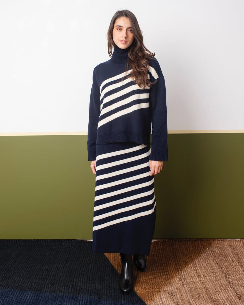 A modern take on the classic French marinière, the Mélanie sweater features a wool–cashmere blend with wide diagonal stripes extending to the sleeves. The slightly high collar keeps you warm, making it a timeless piece to wear with jeans, dresses, or paired with the Manelle skirt for a coordinated look.