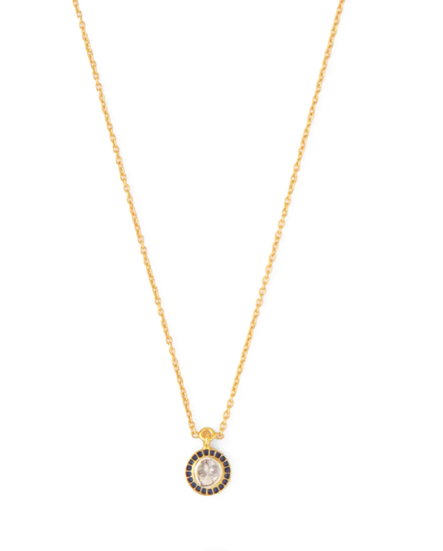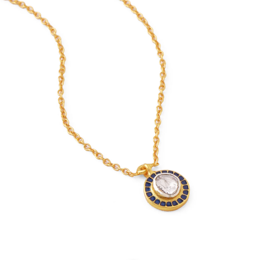 Chaîne de cou avec pendentif en diamant Polki, orné de détails en émail artisanal bleu foncé.