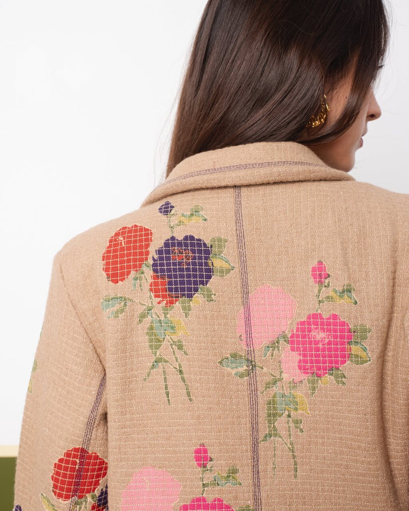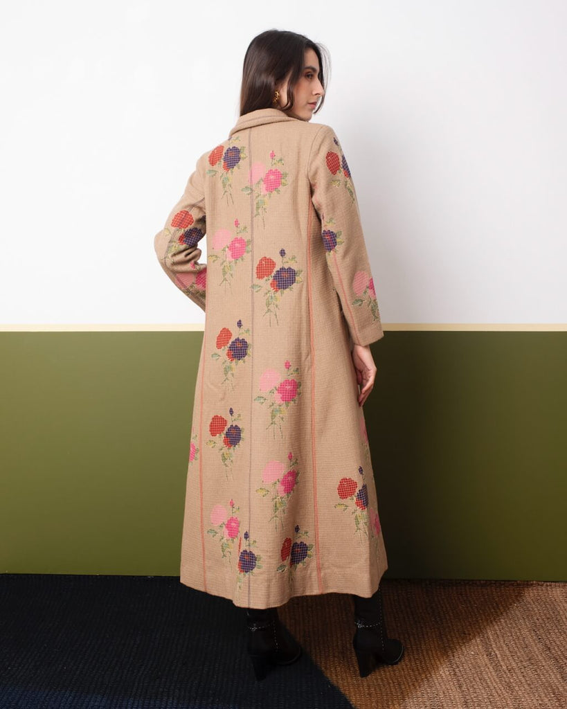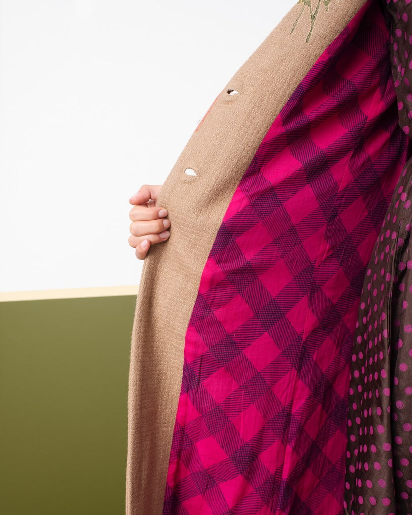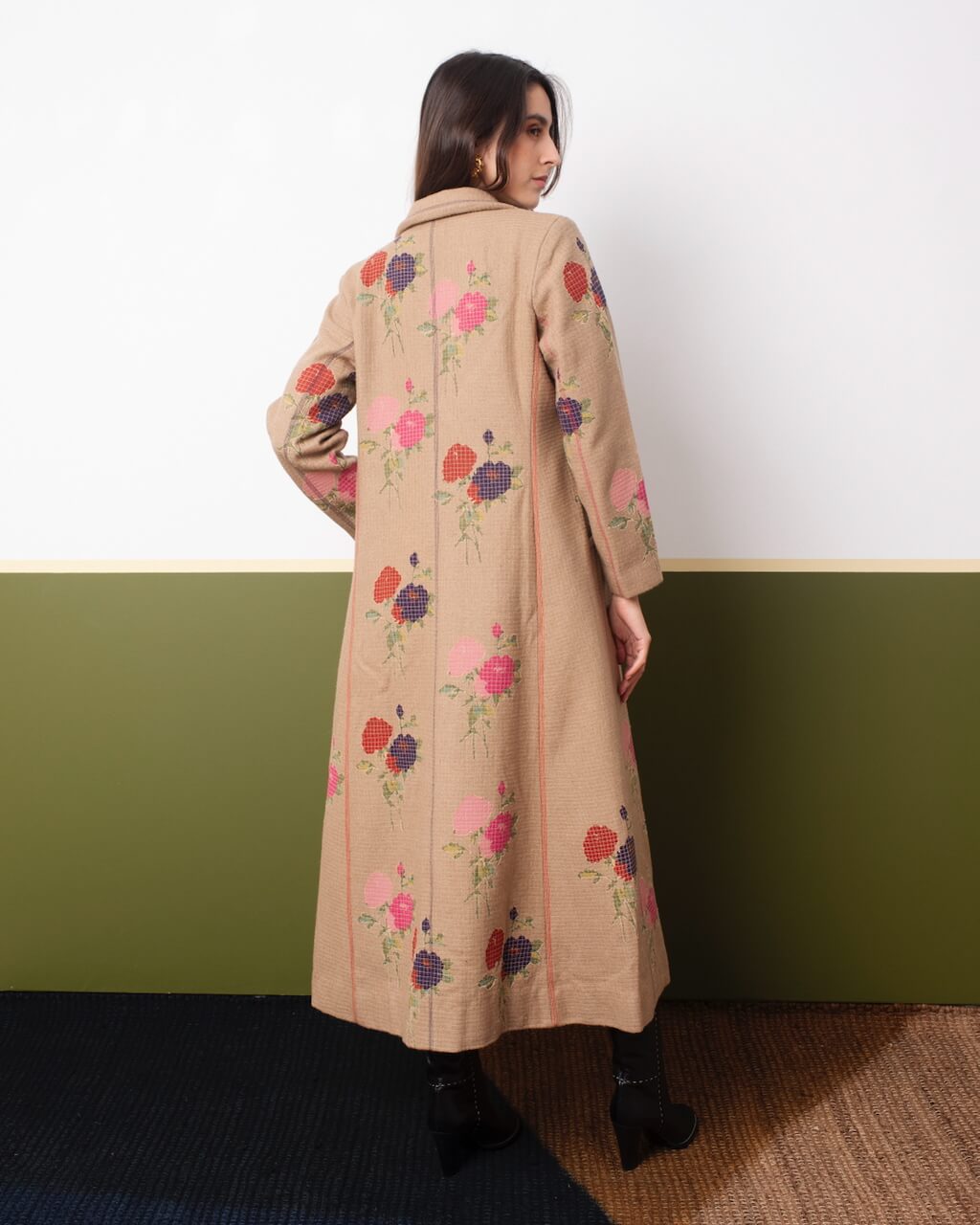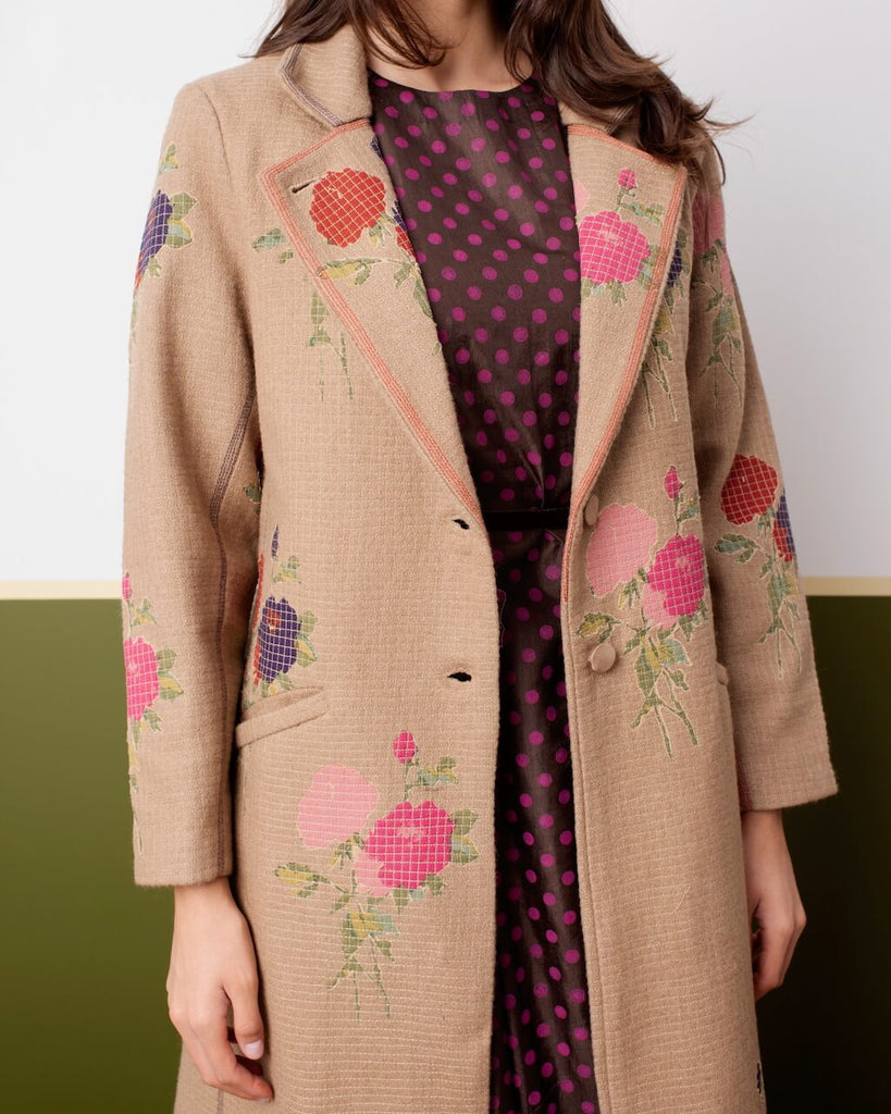 Long manteau d'hiver en laine beige à revers structurés, imprimé et appliqué à la main, poches latérales. Entièrement doublé en soie imprimée rose et violet. Conçu pour la chaleur, le confort, le style et les superpositions saisonnières.