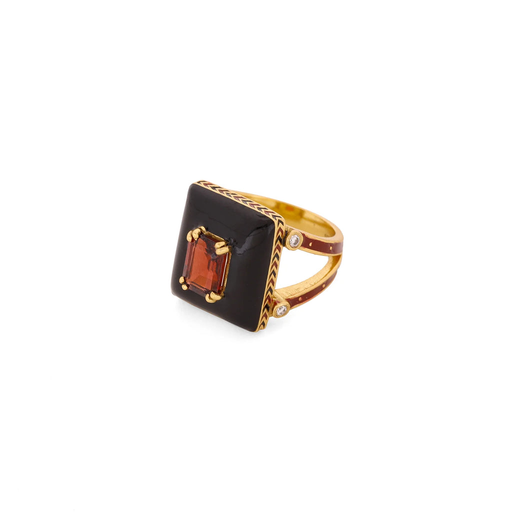 Un scintillant carré noir émaillé à la main avec un centre en grenat, des bords plaqués or délicatement détaillés avec de l'émail et de minuscules diamants. Parfait comme bague de journée comme de soirée.