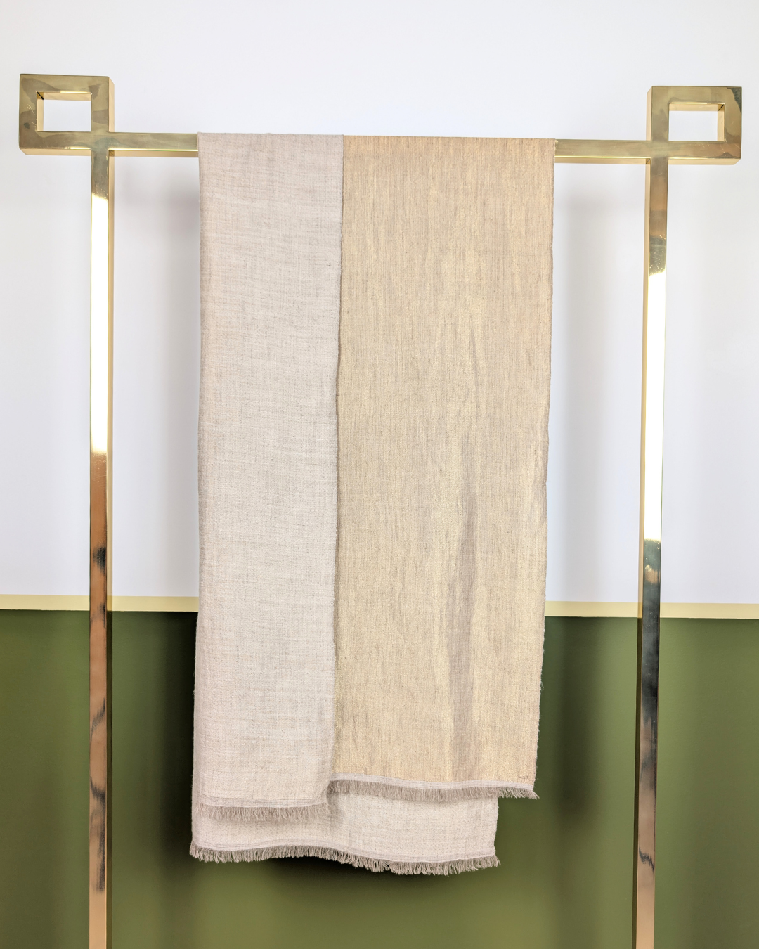 Un châle réversible en 80% pashmina et 20% fil métallique, filé et tissé à la main au Cachemire. Un côté brille avec un tissage métallique en diamant, l'autre est en cachemire pur et naturel - raffiné, chaud et élégant sans effort.